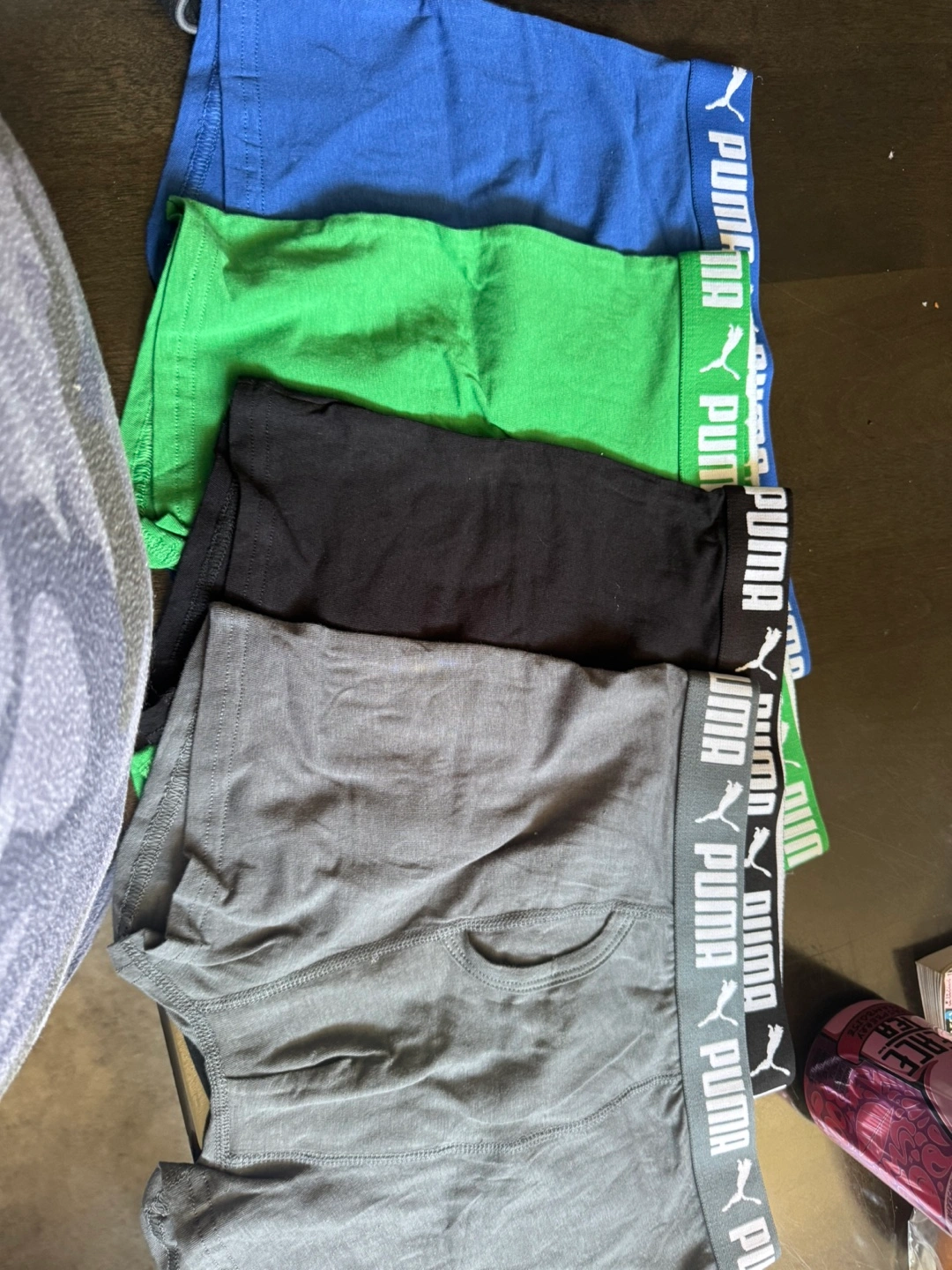 Selling a set of Puma boys boxer briefs. Includes blue, green, black, and gray pairs. Size large. New never used!