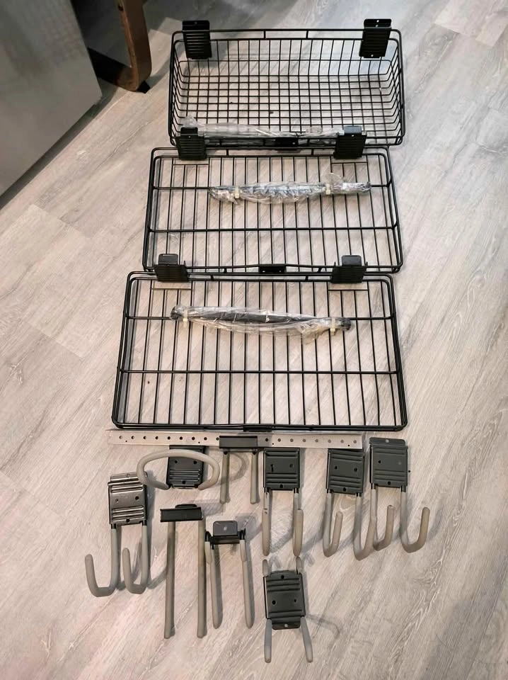 Good quality and heavy duty. Those three trays are never used. Dimensions are in photos. The hooks are in good condition. They don't come with screws so I guess you may need to get some for installation from store. Price is for all in total. Pick up in DT only, near Front St. E/Princess St. Please see other items listed.