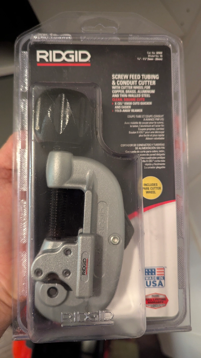 Selling a brand new Ridgid Screw Feed Tubing & Conduit Cutter! It comes with a cutter wheel for copper, brass, aluminum, and thin-walled steel, ensuring clean, square cuts. The X-Cel knob makes cuts quicker and easier, and it even has a fold-away reamer.