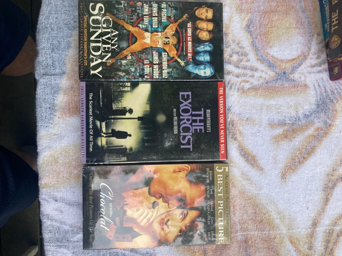 Selling a set of three VHS tapes: Any Given Sunday (Special Edition Director's Cut), The Exorcist (The Version You've Never Seen), and Chocolat. All full-length screening cassettes. The Exorcist is known as 'The Scariest Movie Of All Time' and Chocolat as 'One Of The Best Pictures Of The Year'