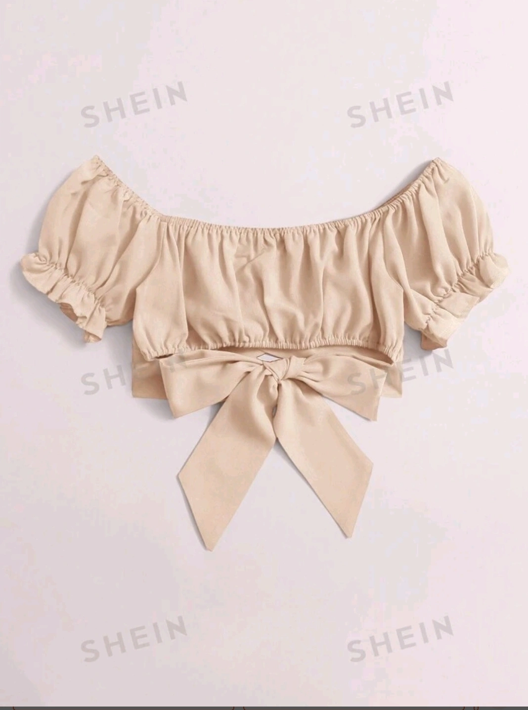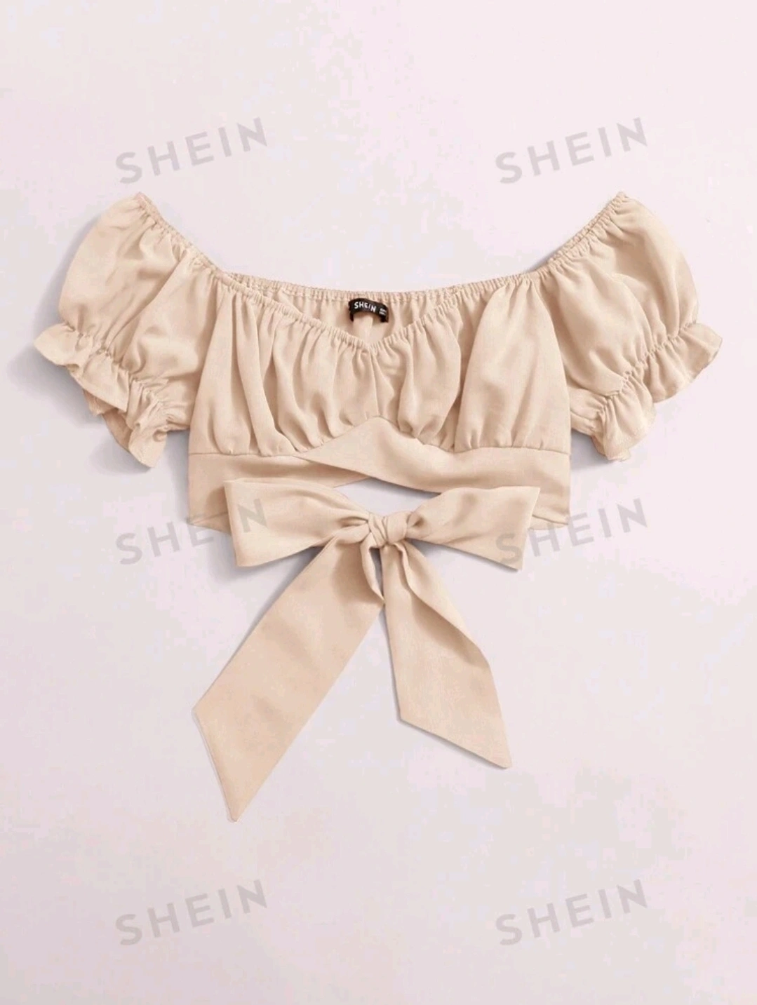 Brand new. Check out this cute beige crop top from SHEIN! It features a tie-front design and off-the-shoulder style. Perfect for a casual day out or dressing up for a party.