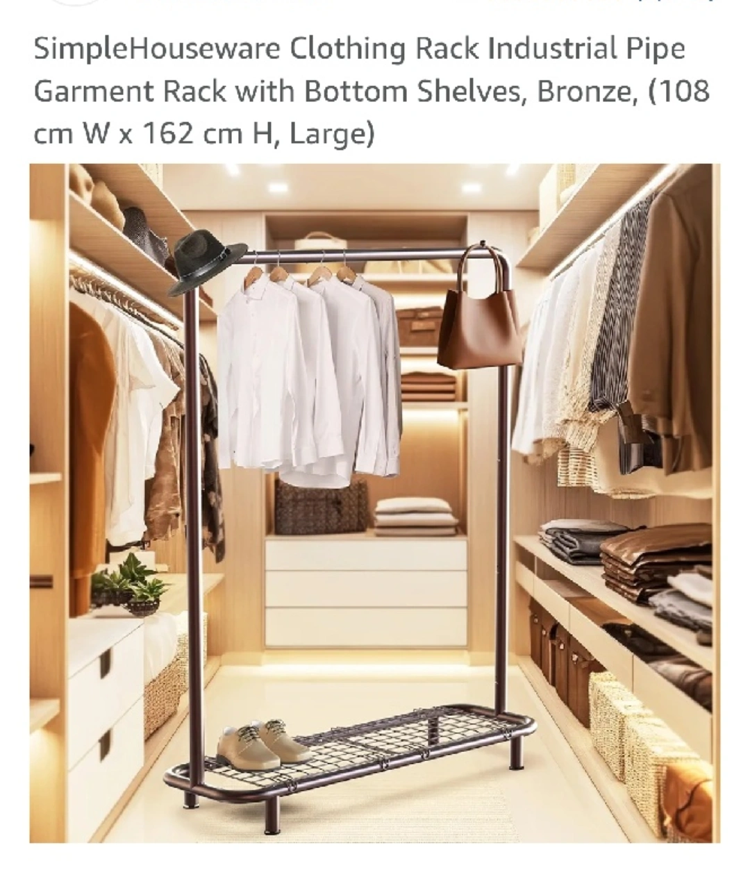 Selling a NEW Simple Houseware clothing rack in bronze! It's an industrial pipe garment rack with bottom shelves. The dimensions are approximately 108 cm wide x 162 cm high. Great for adding extra storage to your closet or creating a display for your favourite clothes!