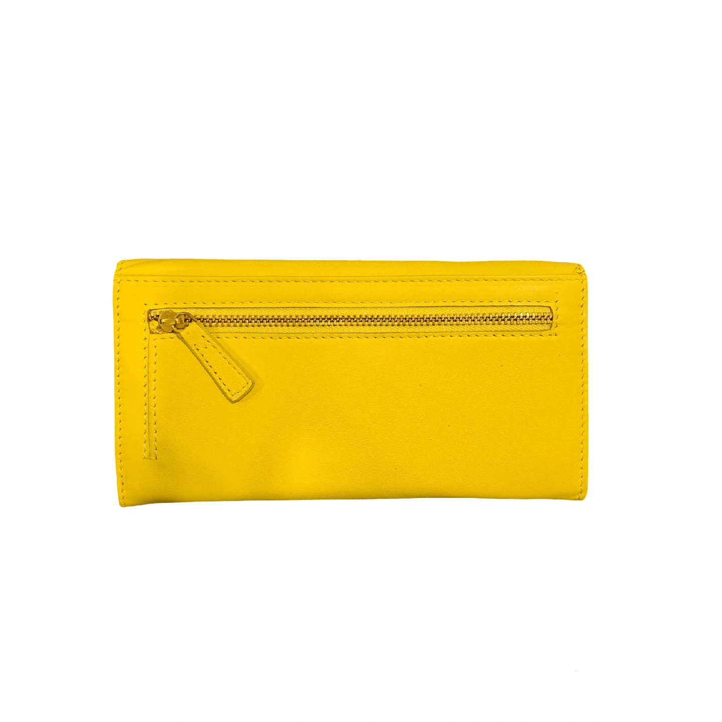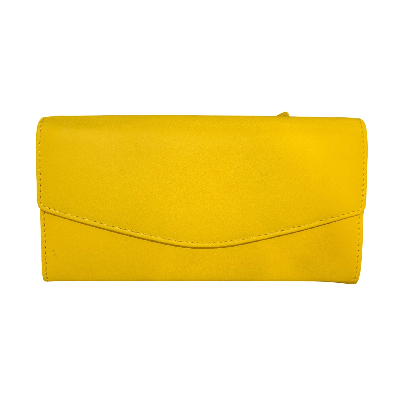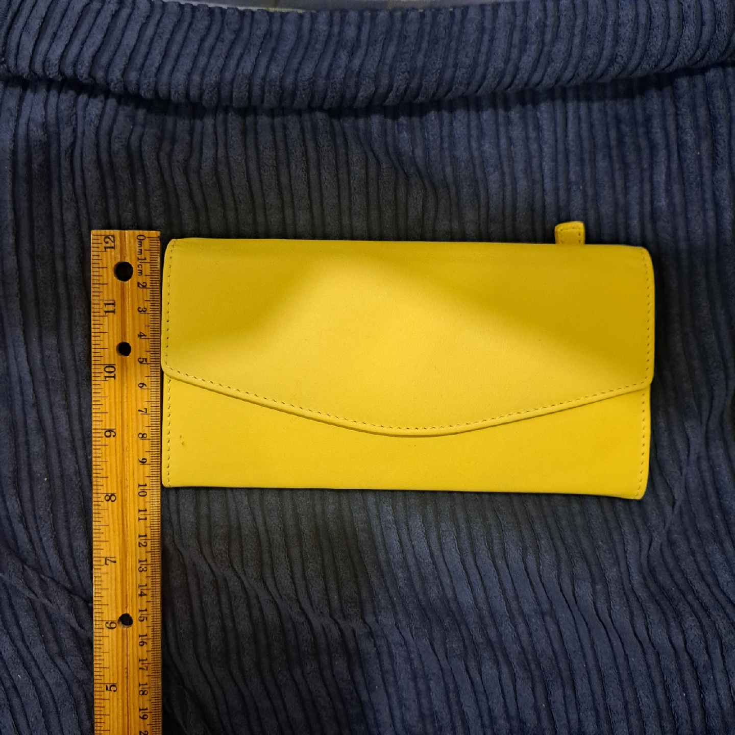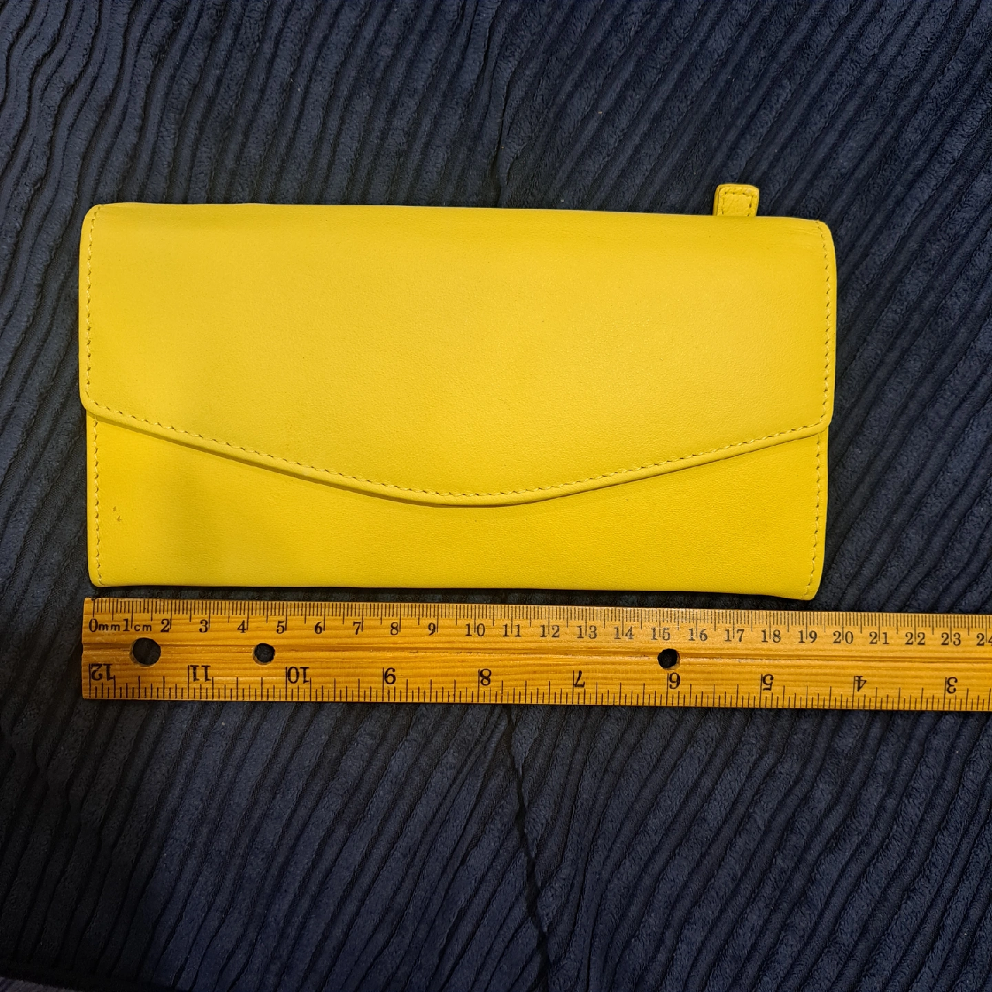 Selling a vibrant yellow leather wallet! The exact shade of yellow is shown on the last slide. It's in great condition and has never been used before. It has lots of space for cards and cash. The wallet is approximately 19.5 cm long. A stylish and practical accessory!