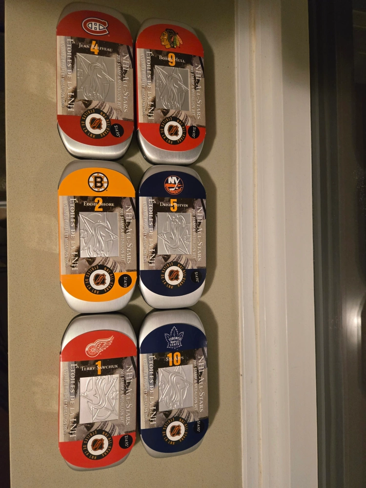 Selling a collection of NHL All Star Stamp and Medallion Sets. 6 Sets. Each set features a different player and team. Includes Jean Beliveau, Bob Hull, Eddie Shore, Denis Potvin, Terry Sawchuk, and Syl Apps. Comes in a protective case