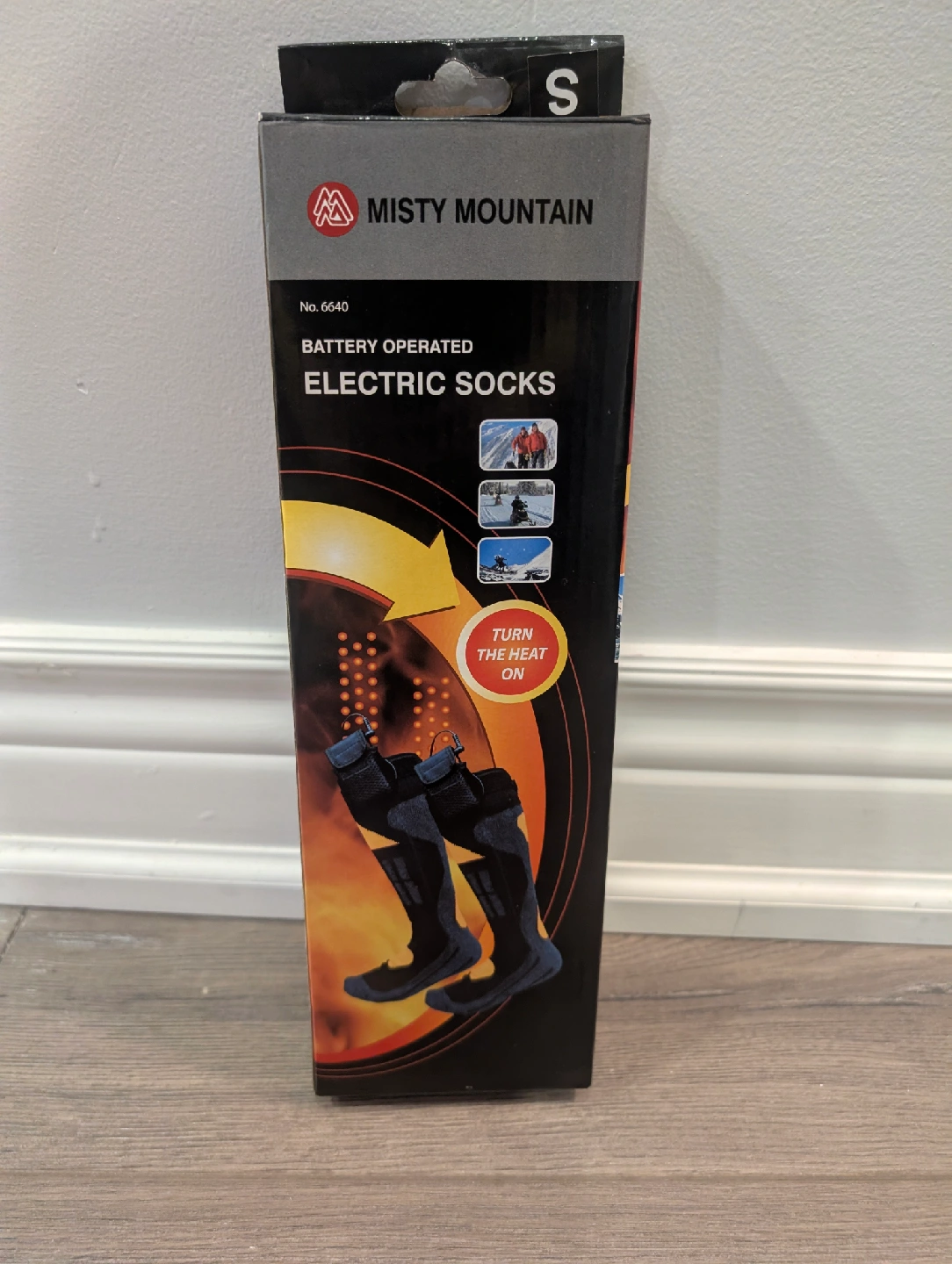 Brand new in box! Keep your toes toasty with these new Misty Mountain battery-operated electric socks, size small, designed to provide warmth and comfort in cold conditions. These socks are perfect for outdoor activities, winter sports, or anyone who needs a little extra warmth. Here are the details: * Size: Small (Men's 5-9, Ladies 6-10) * Material: Heavyweight 80% cotton, 20% spandex * Battery Case: Hard plastic, holds 3 x "AA" batteries (not included) PRICE IS FIRM and if ad up then item is available. Crossposted. Pick up in North Ajax around Salem and Taunton Rd. SFPF home. Pls see my other postings and THANKS for your interest.
