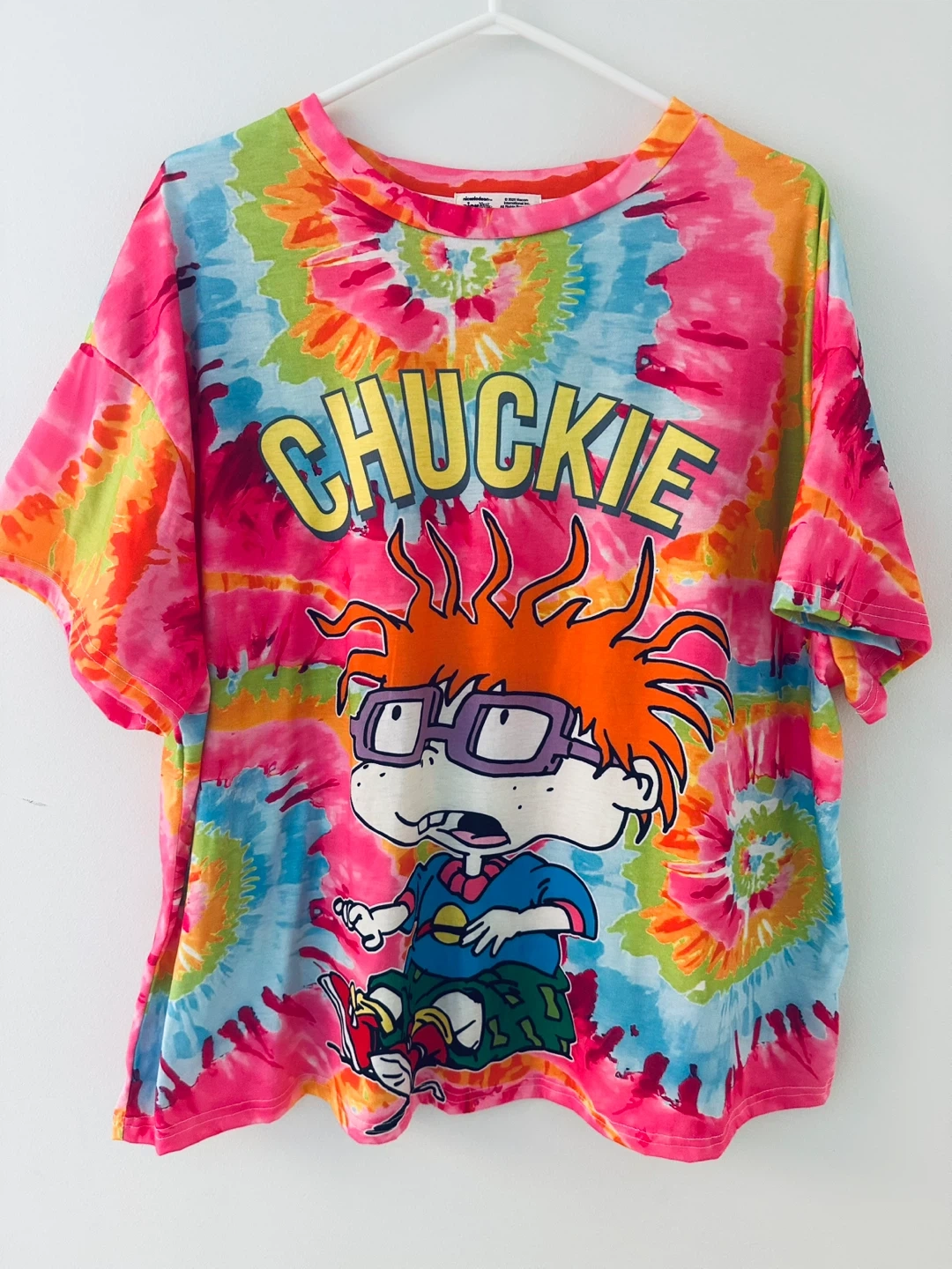 Super fun Nickelodeon Chuckie Finster tie-dye t-shirt! Itās in new condition and it's a size 1XL and features a vibrant colourful tie-dye pattern with Chuckie on the front. Great for any 90s Nick fan!