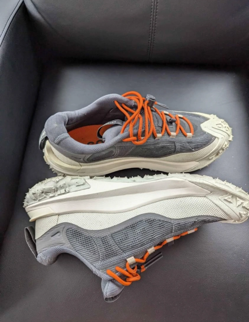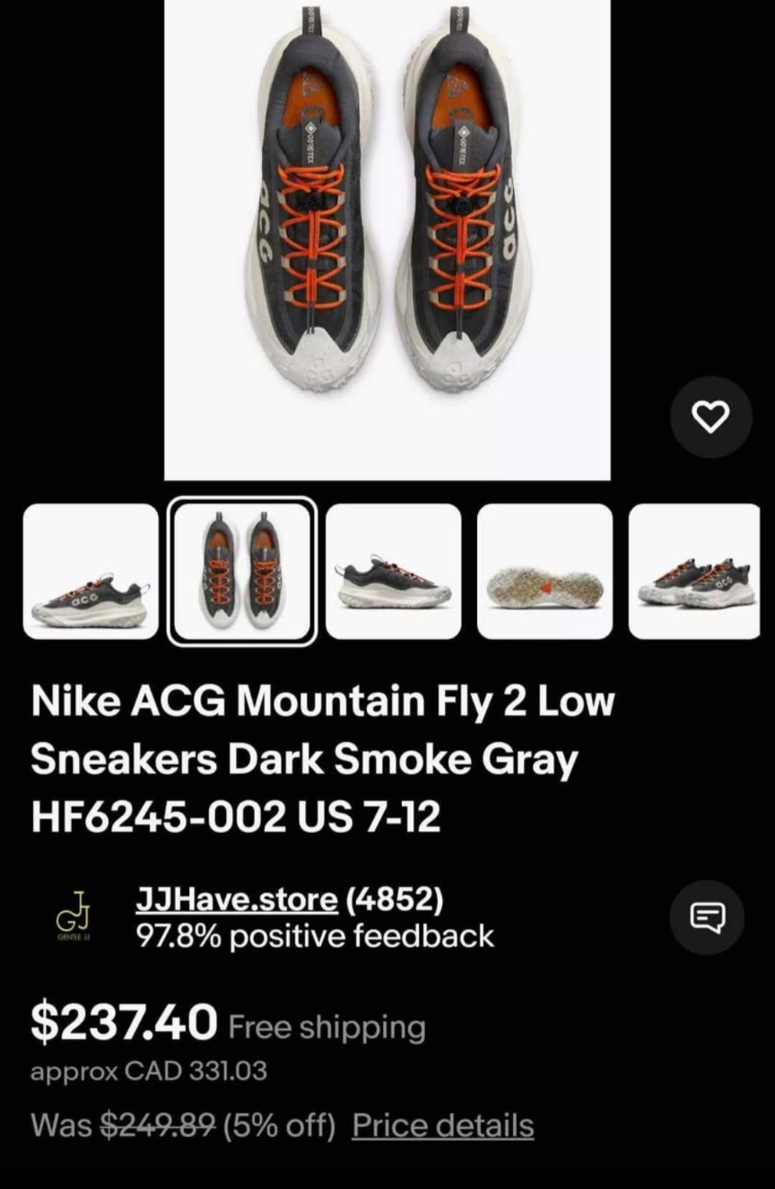 Selling a pair of Nike ACG Mountain Fly 2 Low sneakers in dark smoke gray, size US 8.5. These are in good condition and ready for your next adventure! They feature GORE-TEX material for added protection.