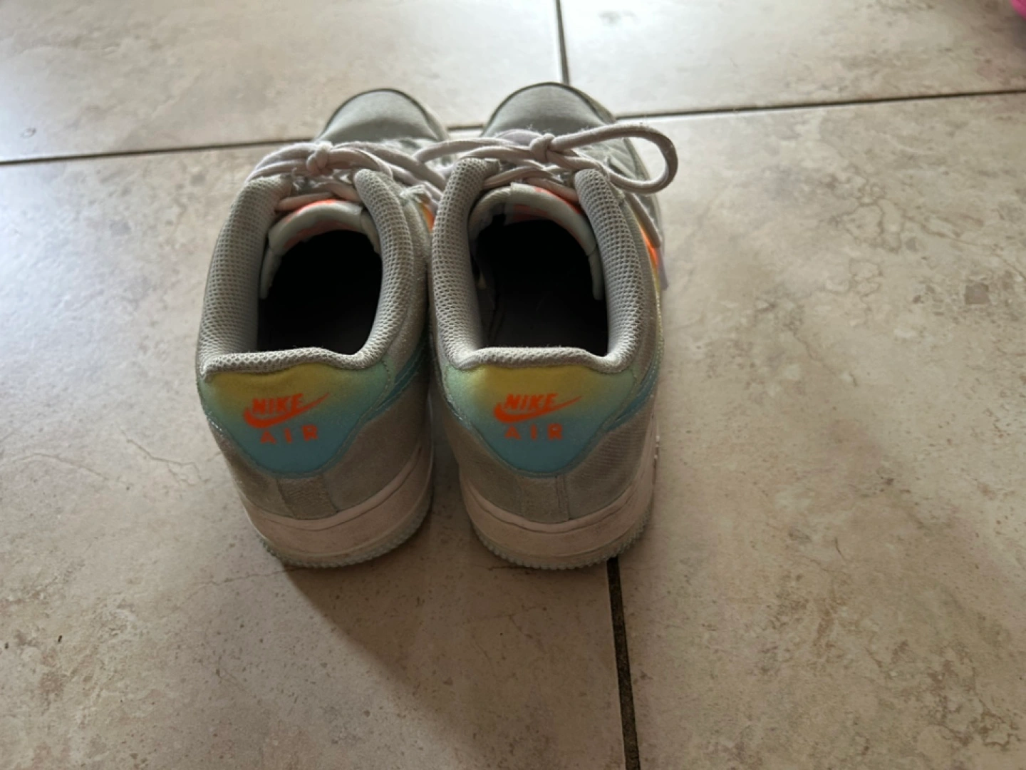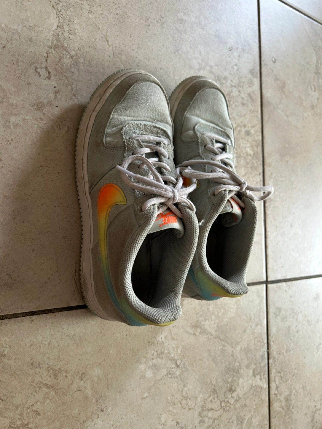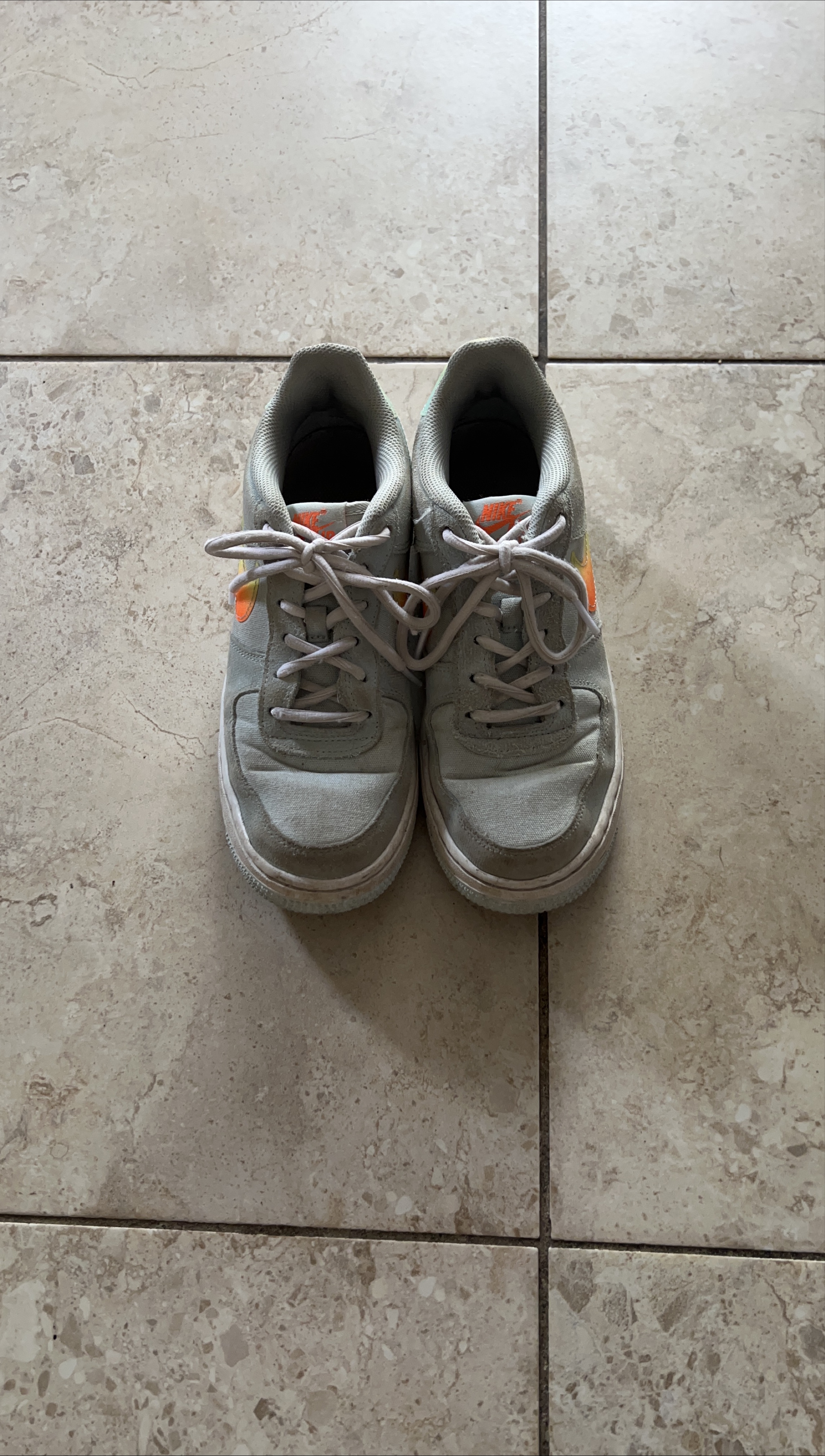 Selling a pair of Nike Air Force 1 sneakers in light blue. They show some signs of wear, but still have lots of life left! The Nike logo has a cool gradient design.