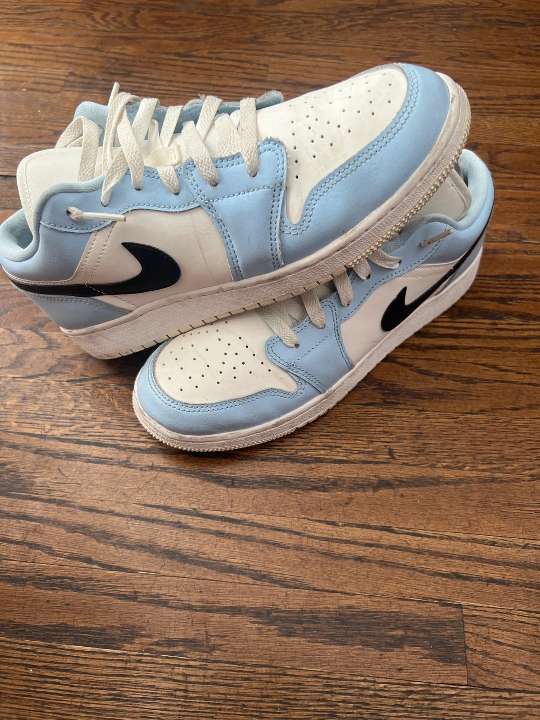 Selling a pair of Nike Air Jordan 1 Low sneakers in the 'UNC' colourway, featuring a mix of blue and white. These shoes are in great condition and ready for a new home! Perfect for casual wear or adding to your sneaker collection size 7 youth