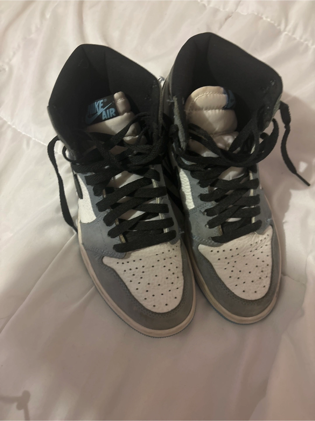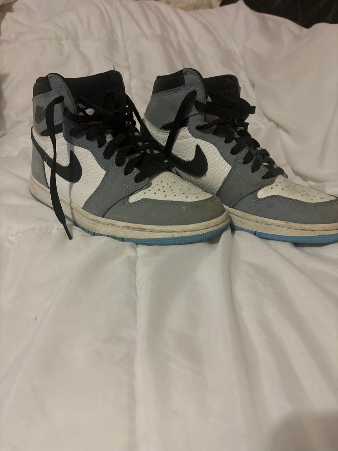 Selling a pair of Nike Air Jordan 1 High University Blue sneakers. They're a bit worn but ready for a new home! These stylish sneakers are perfect for everyday wear or adding to your collection I CAN SHIP!!