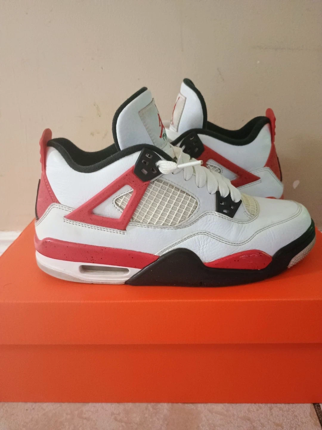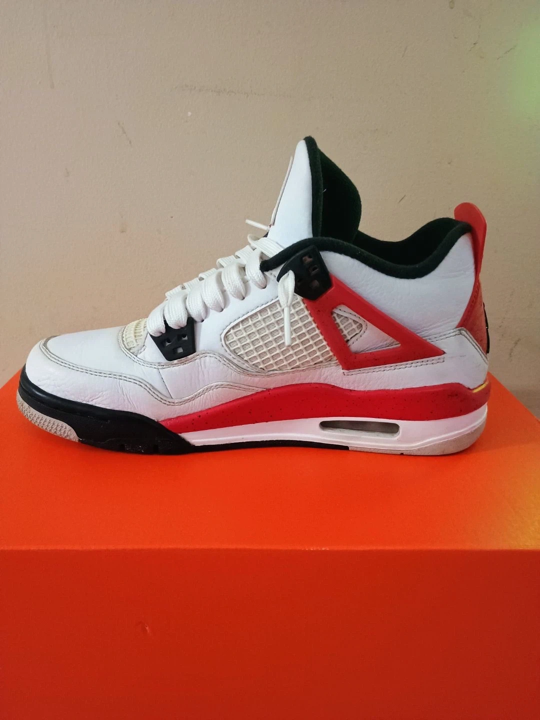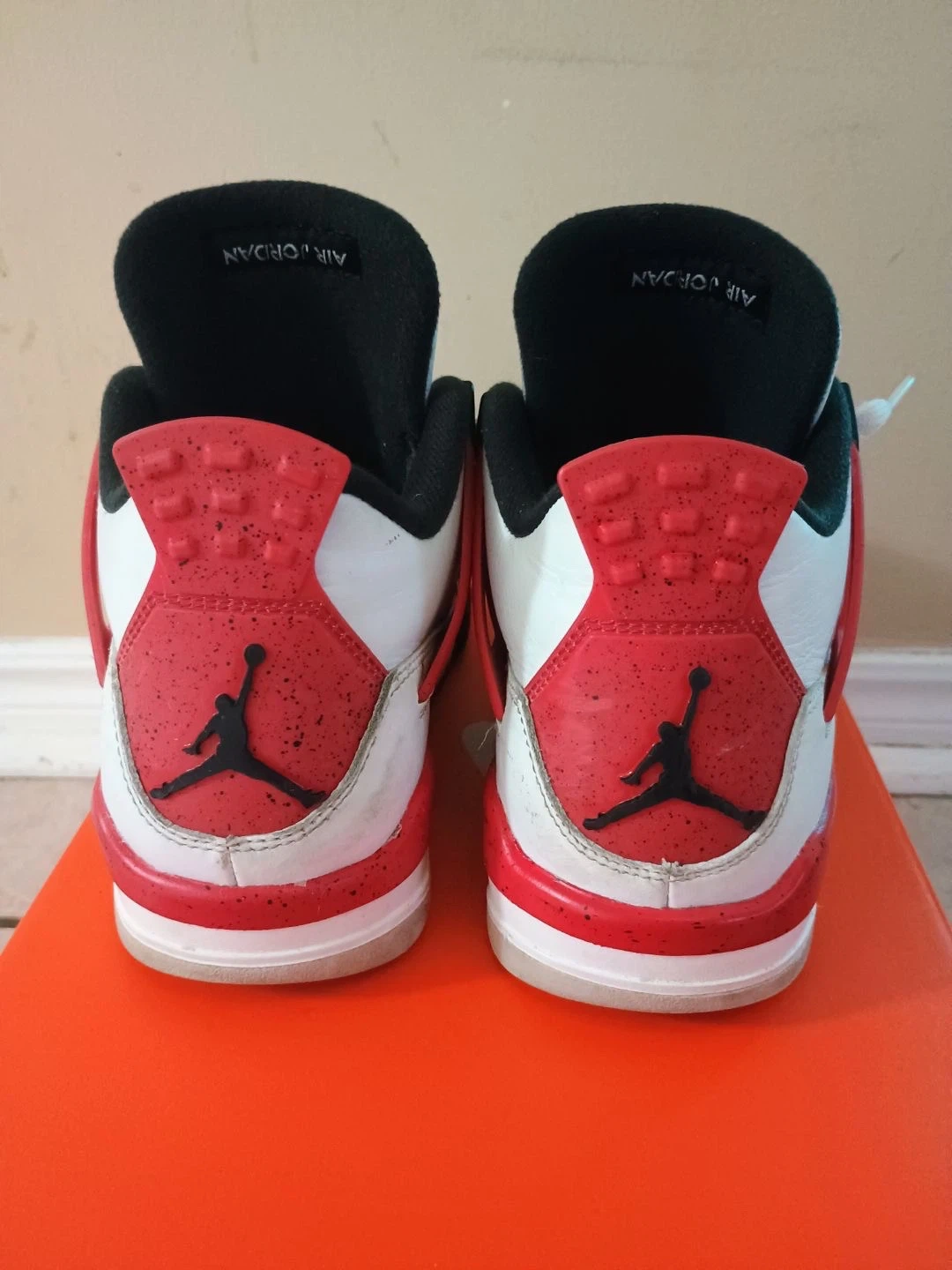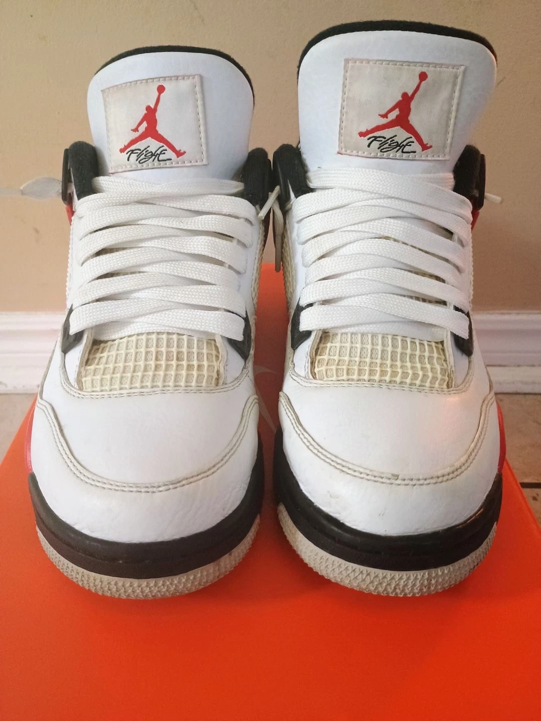 Selling a pair of Nike Air Jordan 4 Retro in white and fire red. The size is US 6.5Y. There are some signs of wear, but overall they're in good condition! Very negotiable price.