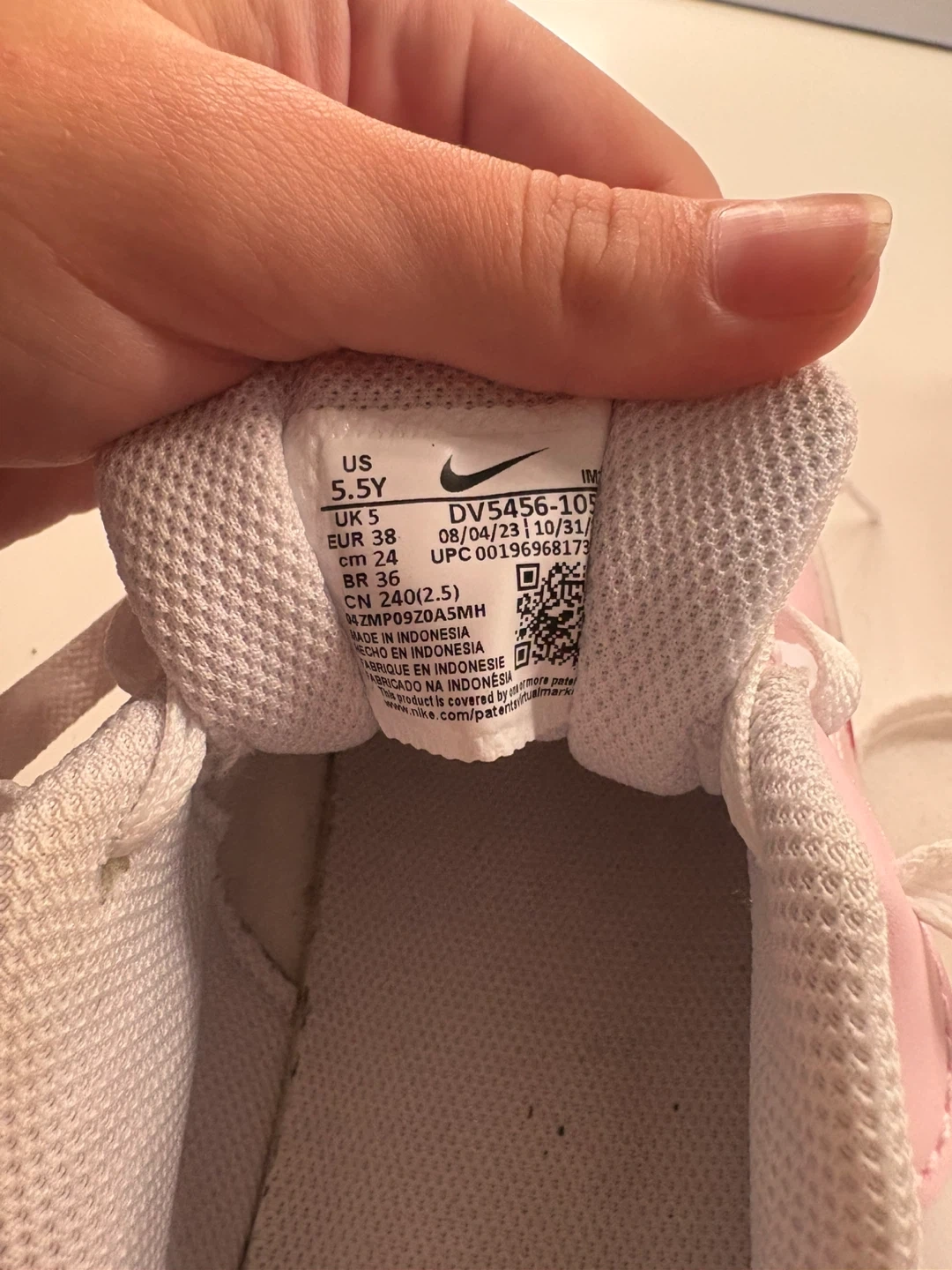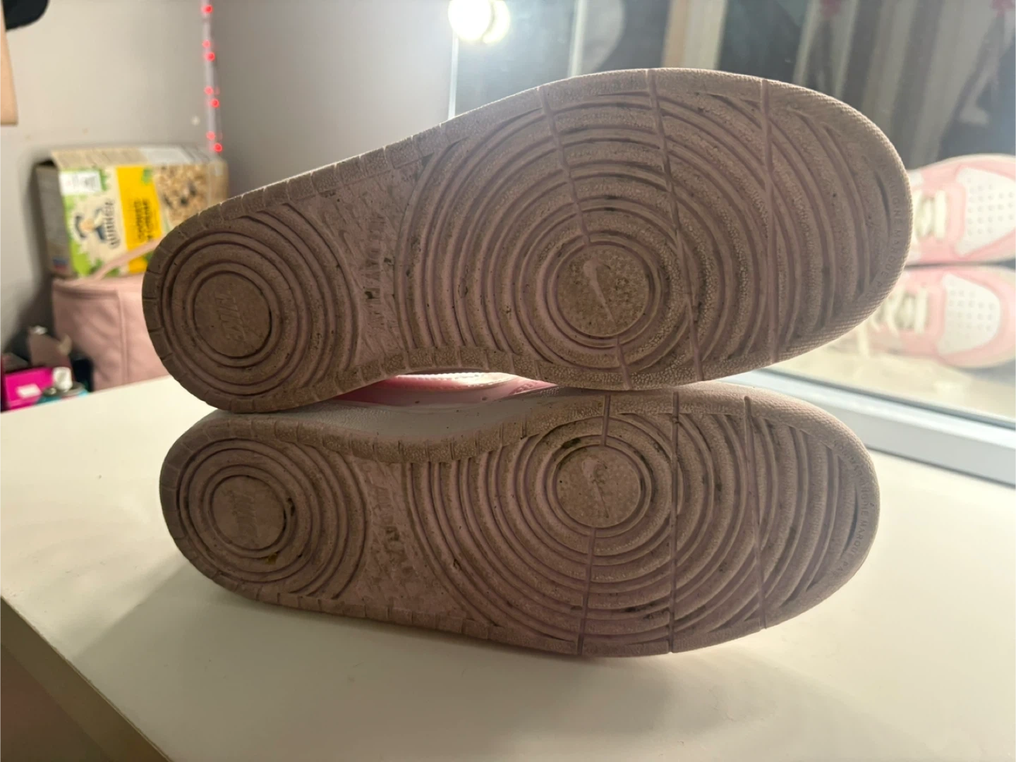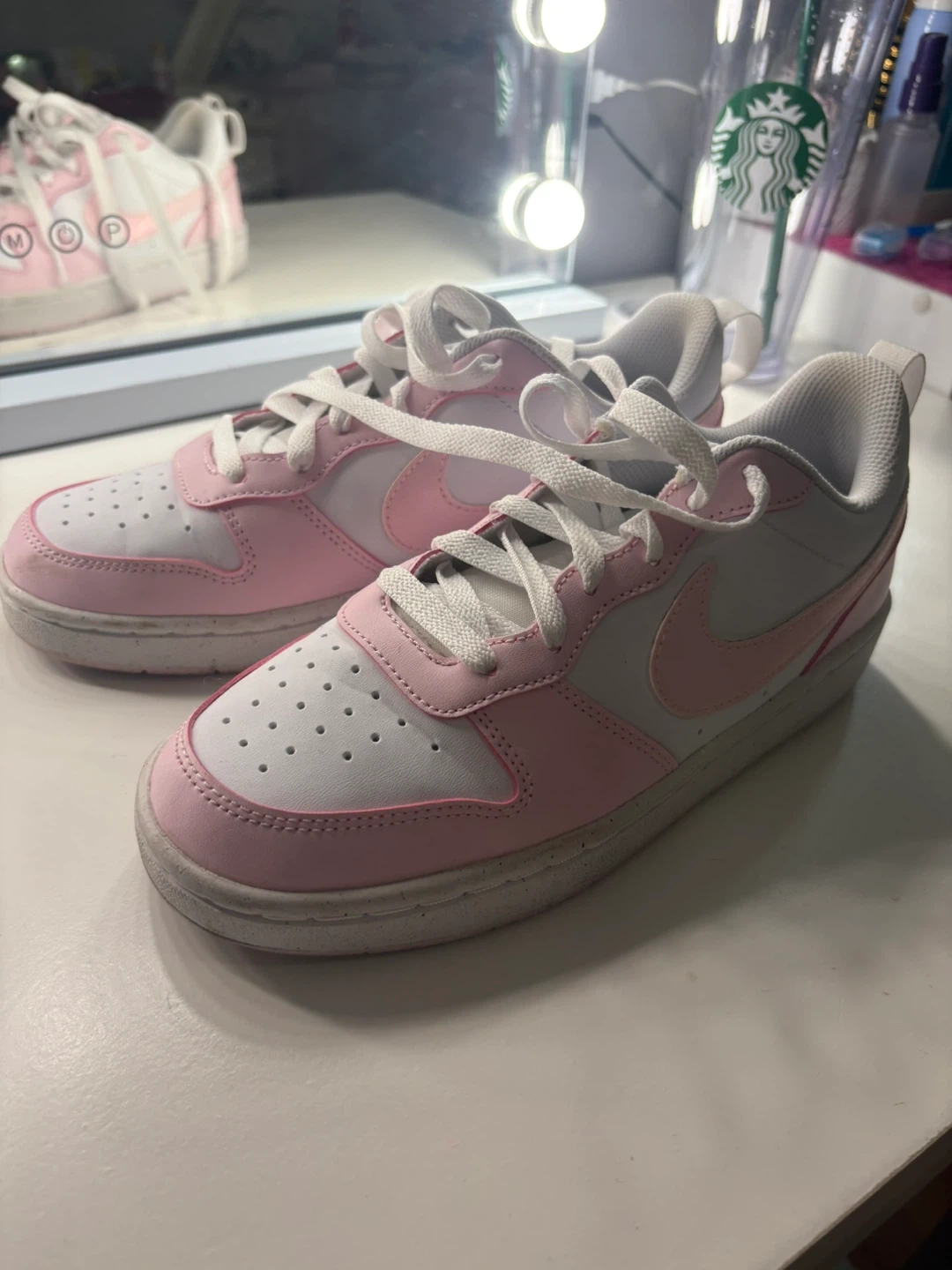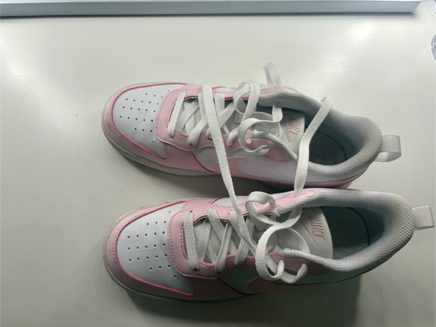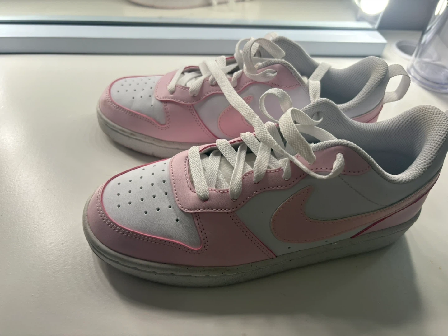 Selling a pair of Nike Court Borough Low 2 sneakers in pink and white! They're in good used condition and are a size 5.5Y (youth). Please see the photos for details on the condition of the soles.