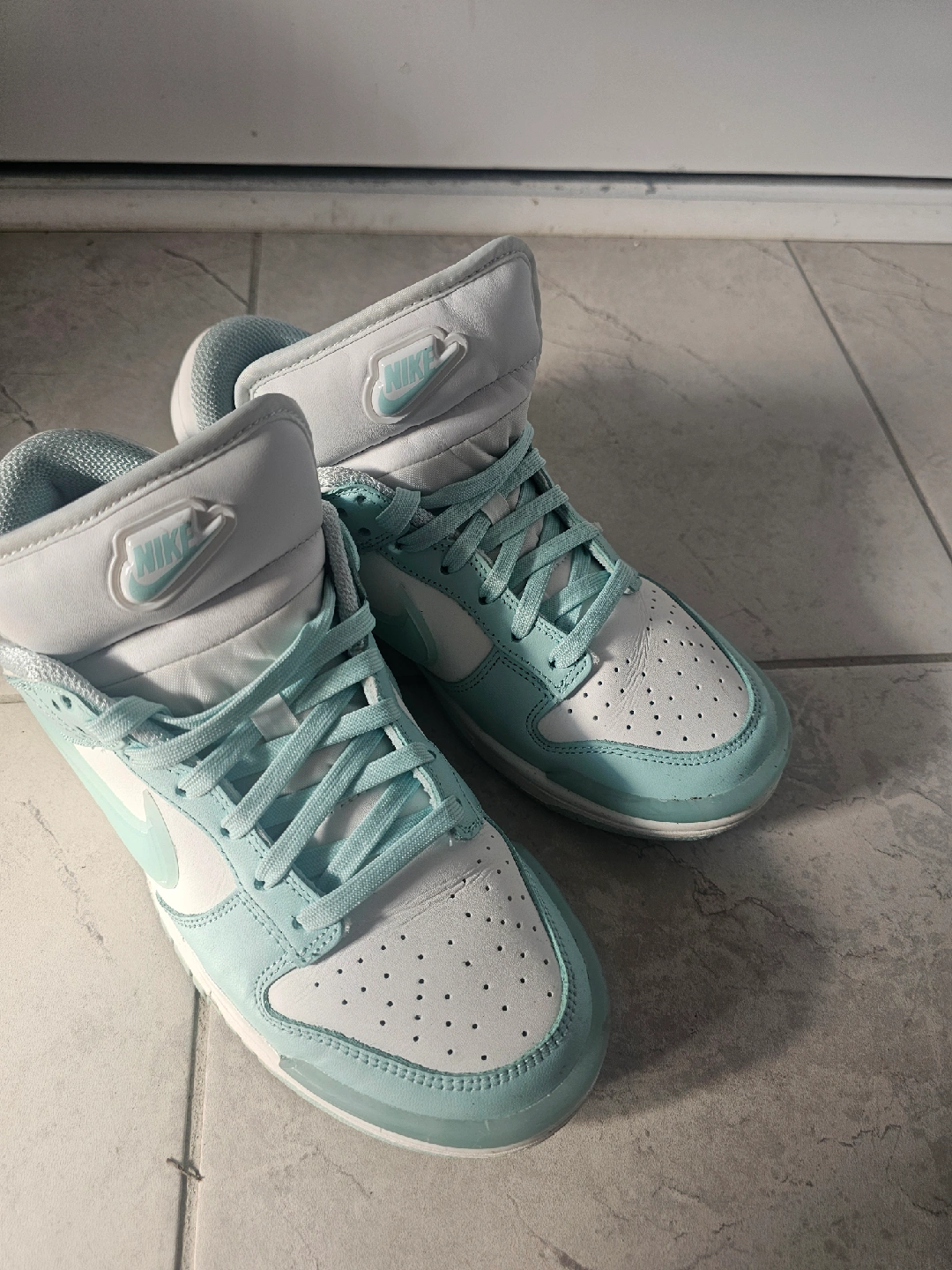 Selling a pair of Nike Dunk High sneakers in a refreshing Summit White and Light Mint/blue colour. They're in great shape and ready for a new home! The shoes are a women's size 8.5