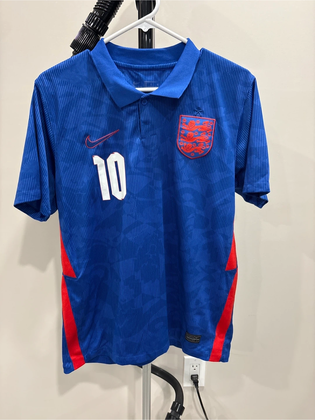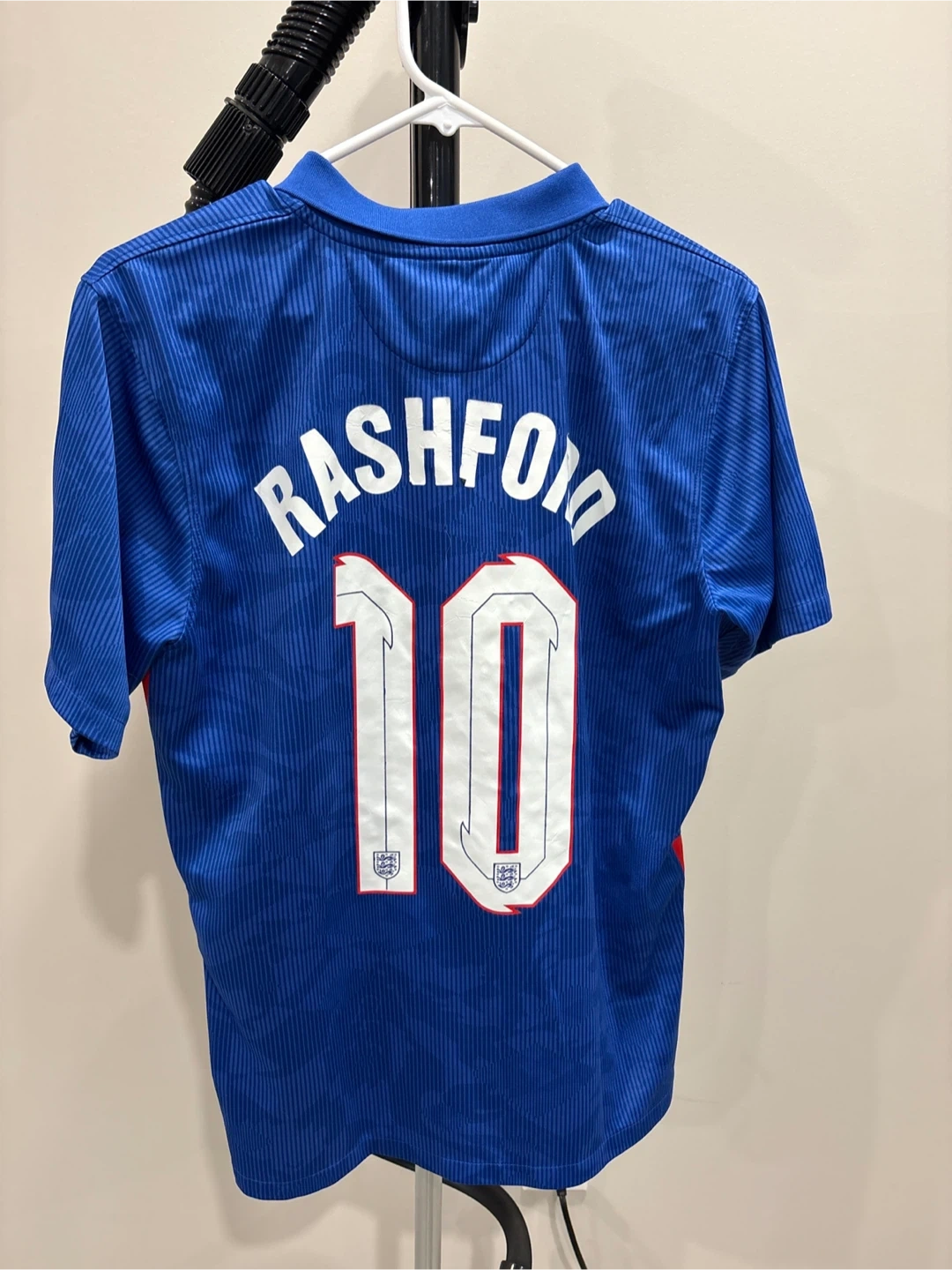 Selling a Nike England soccer jersey with Rashford's name and number 10 on the back. The jersey is blue with red accents and features the England team crest and Nike logo. It's in great condition and perfect for any soccer fan! Size M