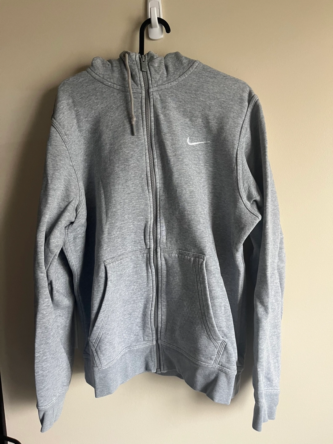 Selling a Nike full-zip hoodie in grey! Perfect for layering or wearing on its own.