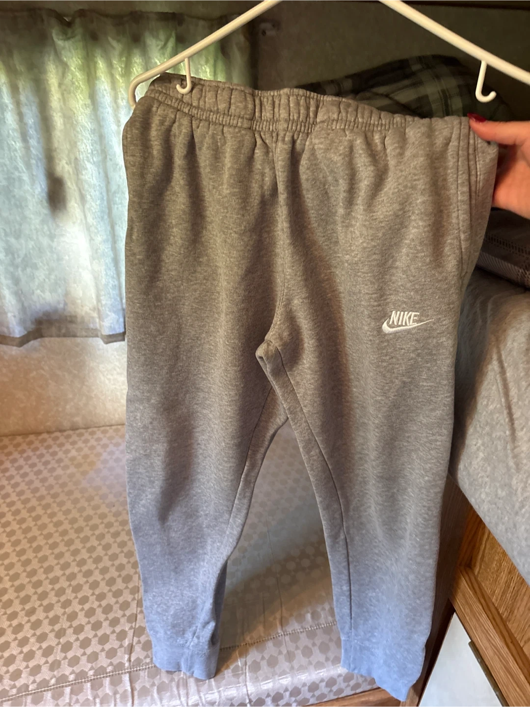 Selling a pair of gently used Nike sweatpants in a neutral grey colour. They're super comfy and perfect for lounging around the house or running errands. No rips or stains!