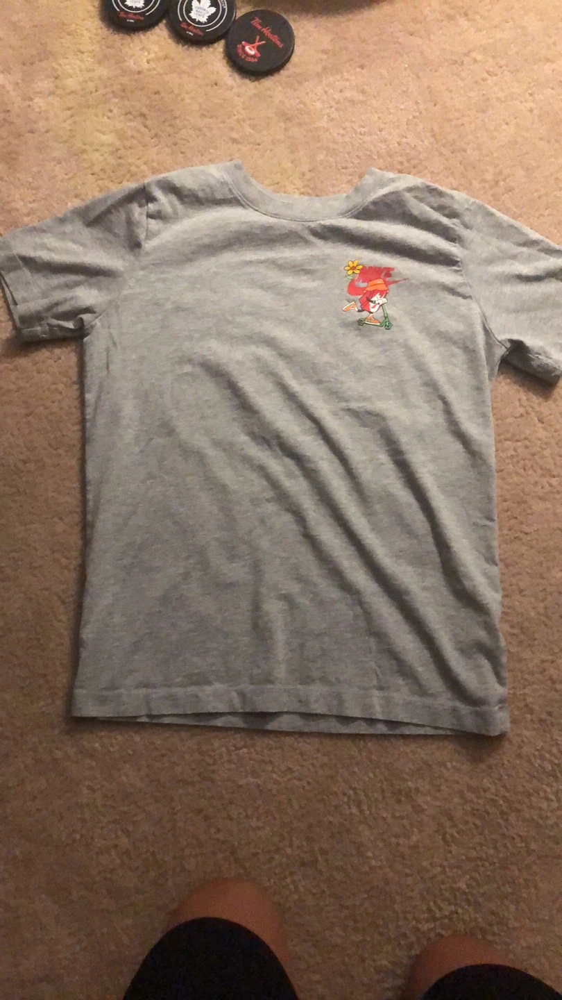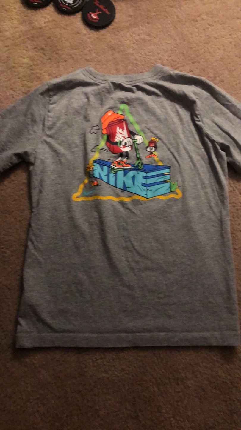 Selling a grey Nike t-shirt with a fun graphic on the back and front. It's in great condition and ready for a new home!