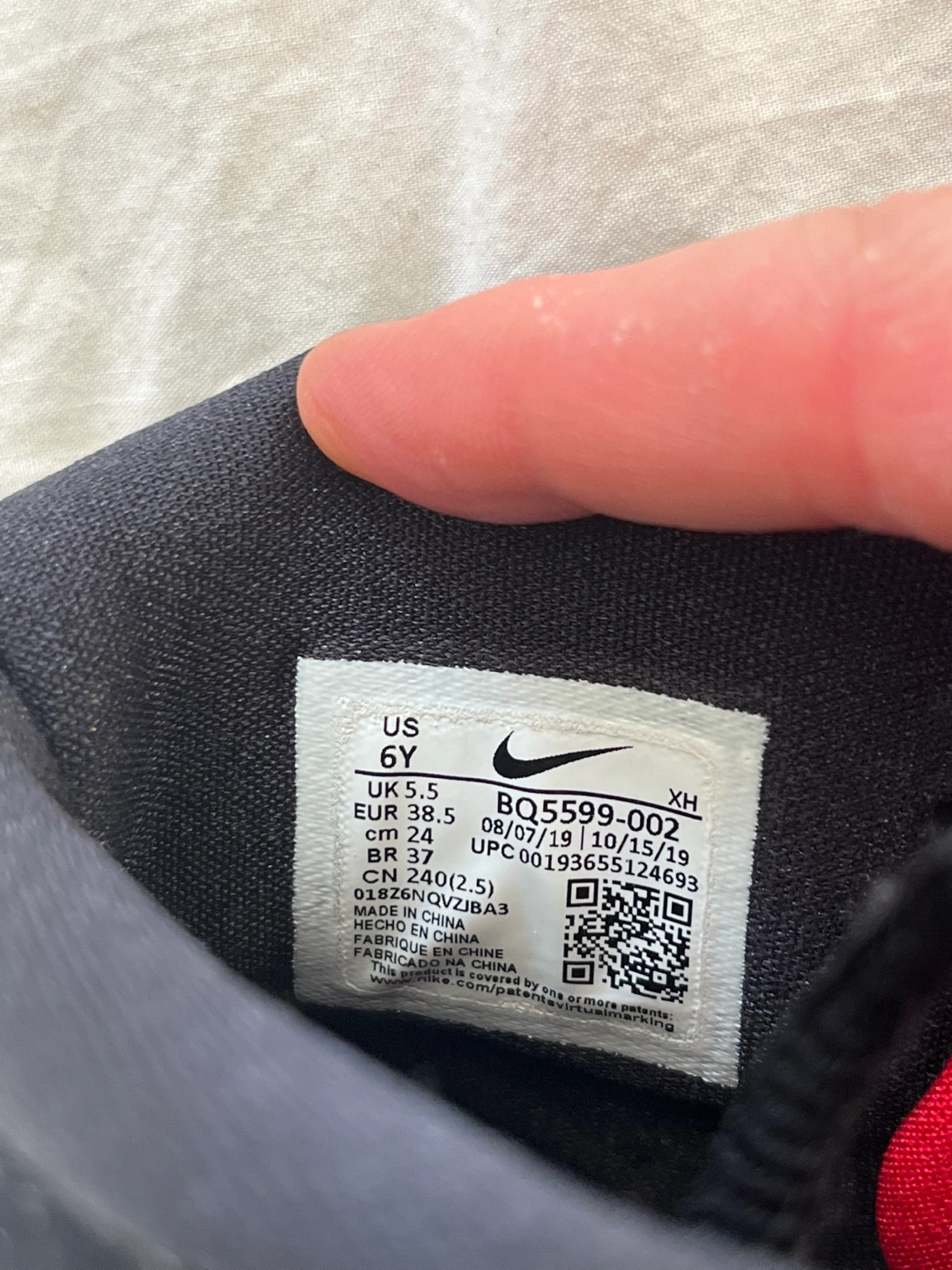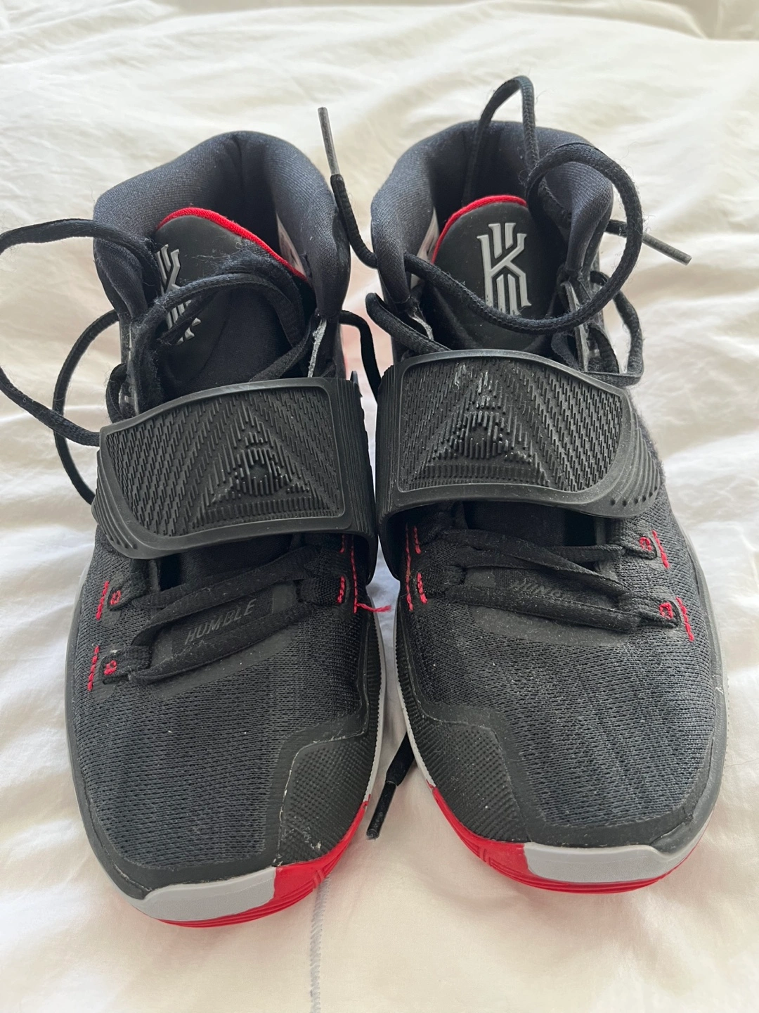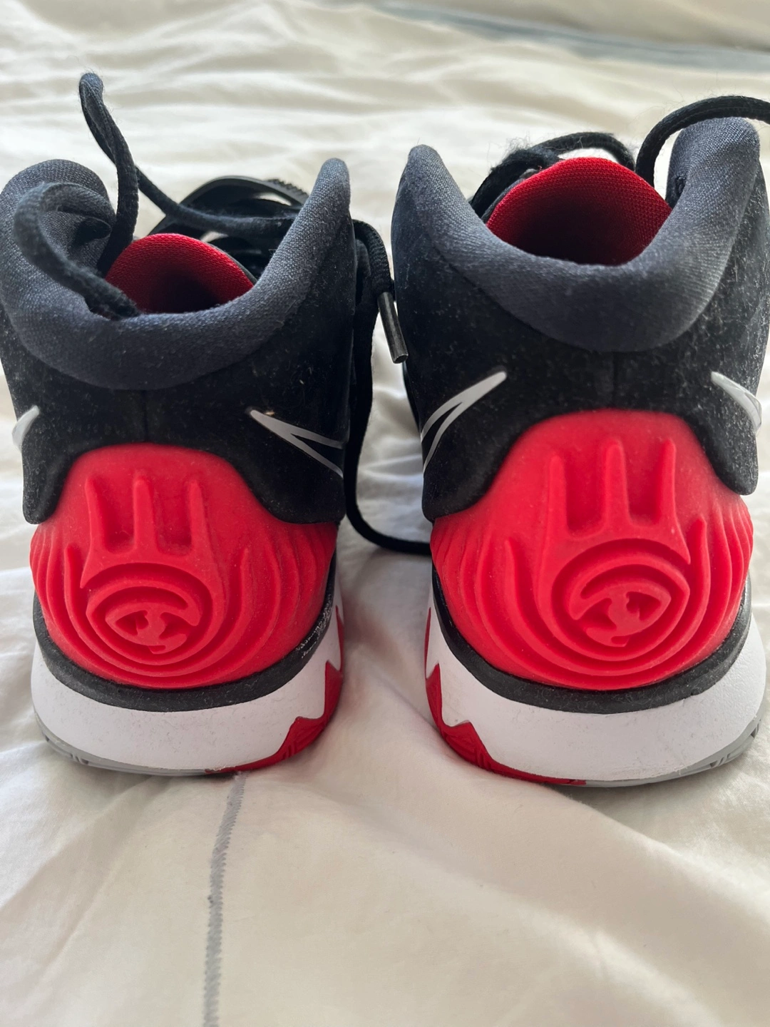Black and red Nike Kyrie 6 basketball shoes. Size 6Y. Good condition. Features a velcro strap. These shoes still have a lot of life left in them.