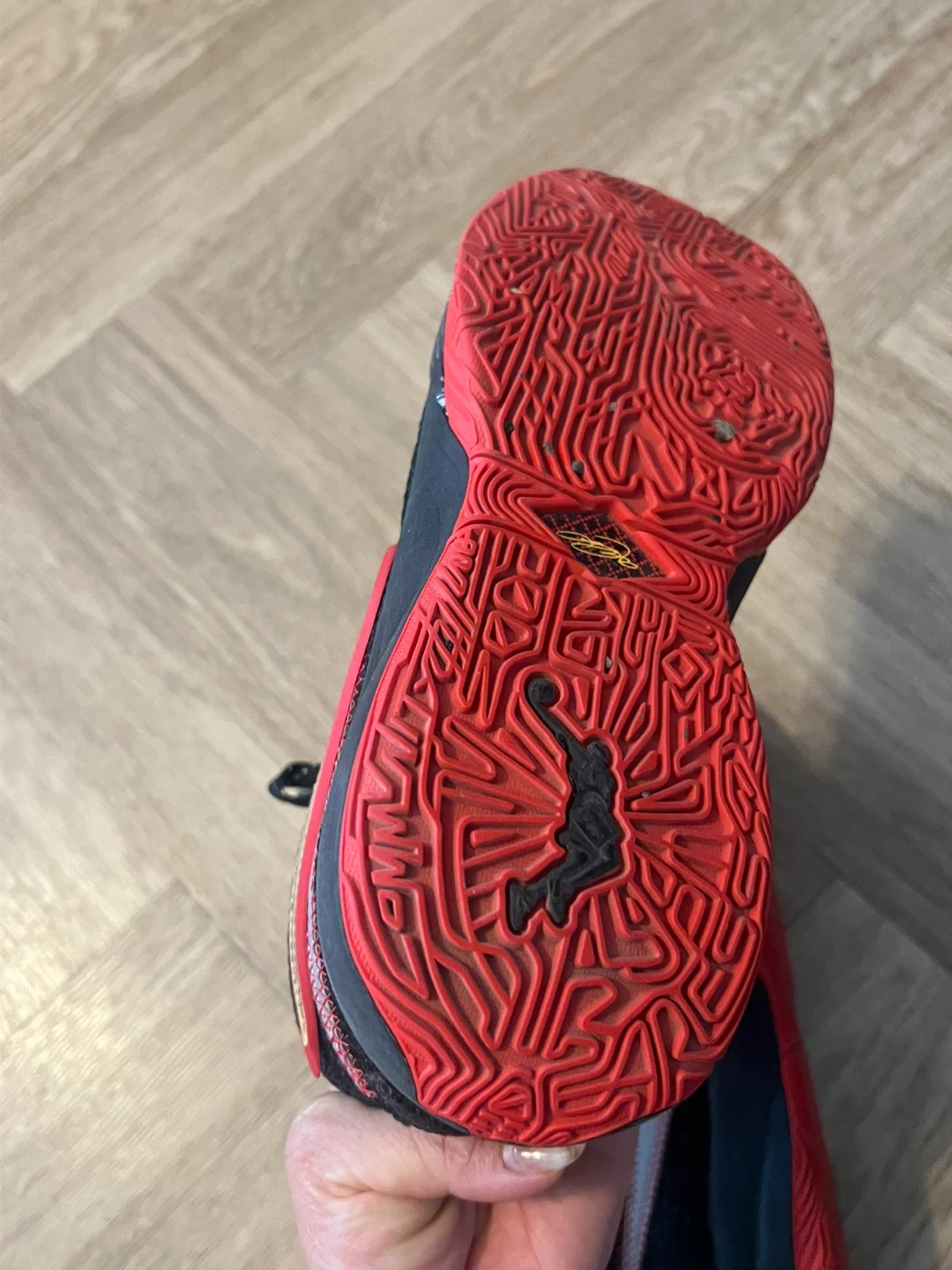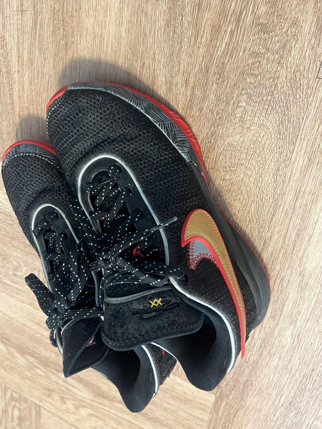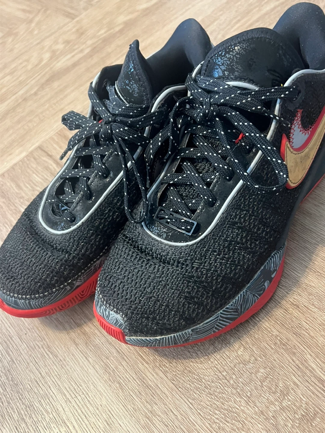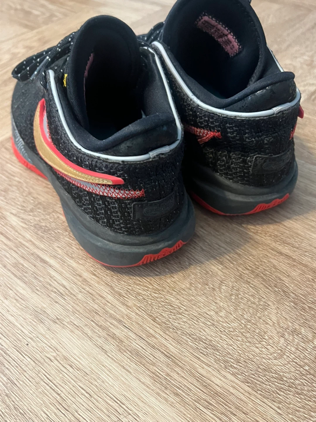 Selling a pair of Nike LeBron Witness 7 shoes in black with gold accents. These are in great condition and ready for a new home! The soles are red, providing a cool contrast to the black upper. Perfect for basketball or casual wear