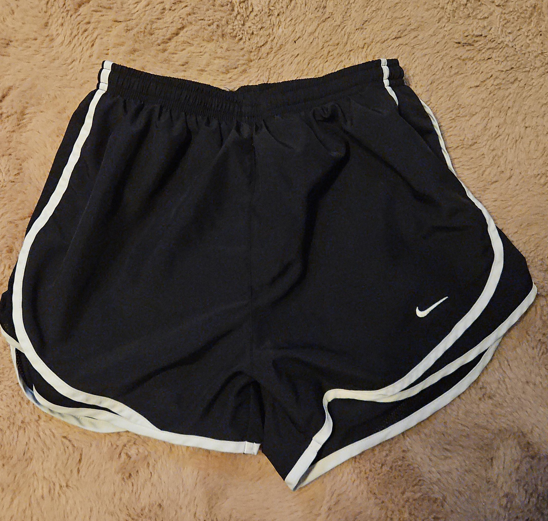 Selling a pair of Nike running shorts in black with white trim! They're in great condition and ready for your next run or workout. The classic design and comfortable fit make them a perfect addition to your athletic wardrobe