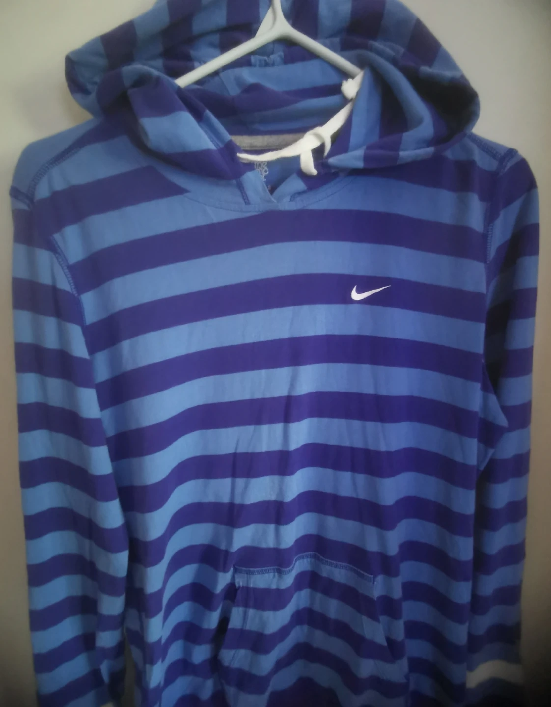 Here's a comfy Nike hoodie with a cool striped pattern in shades of blue! It features a classic hoodie design with a front pocket. Perfect for casual wear or layering on cooler days
