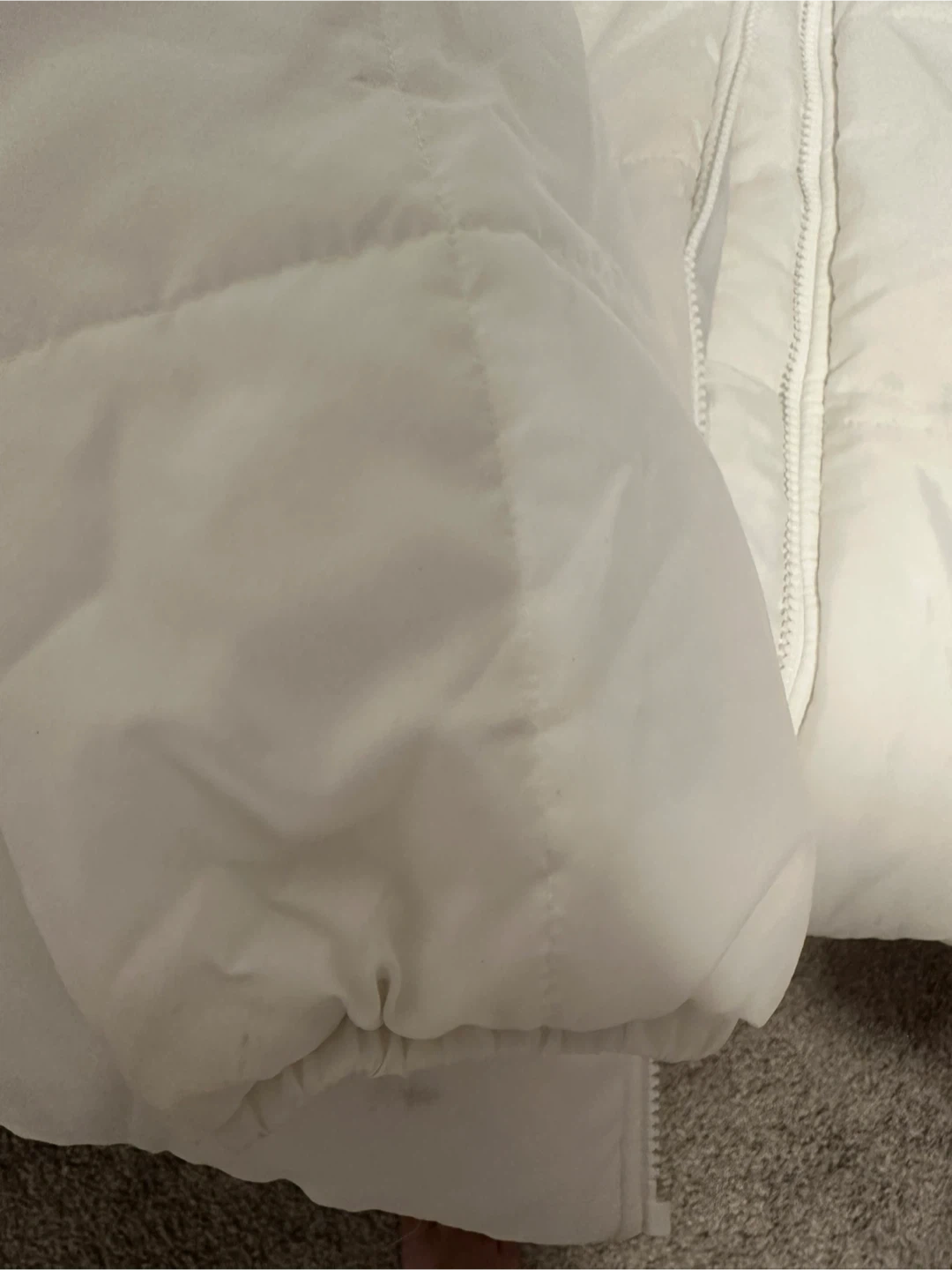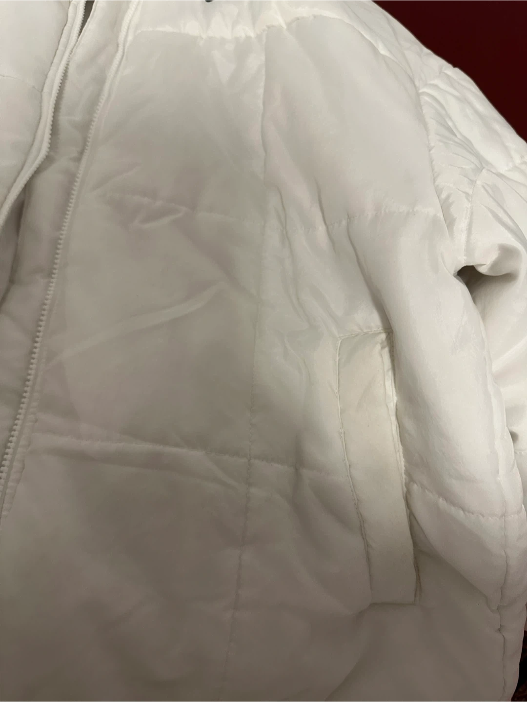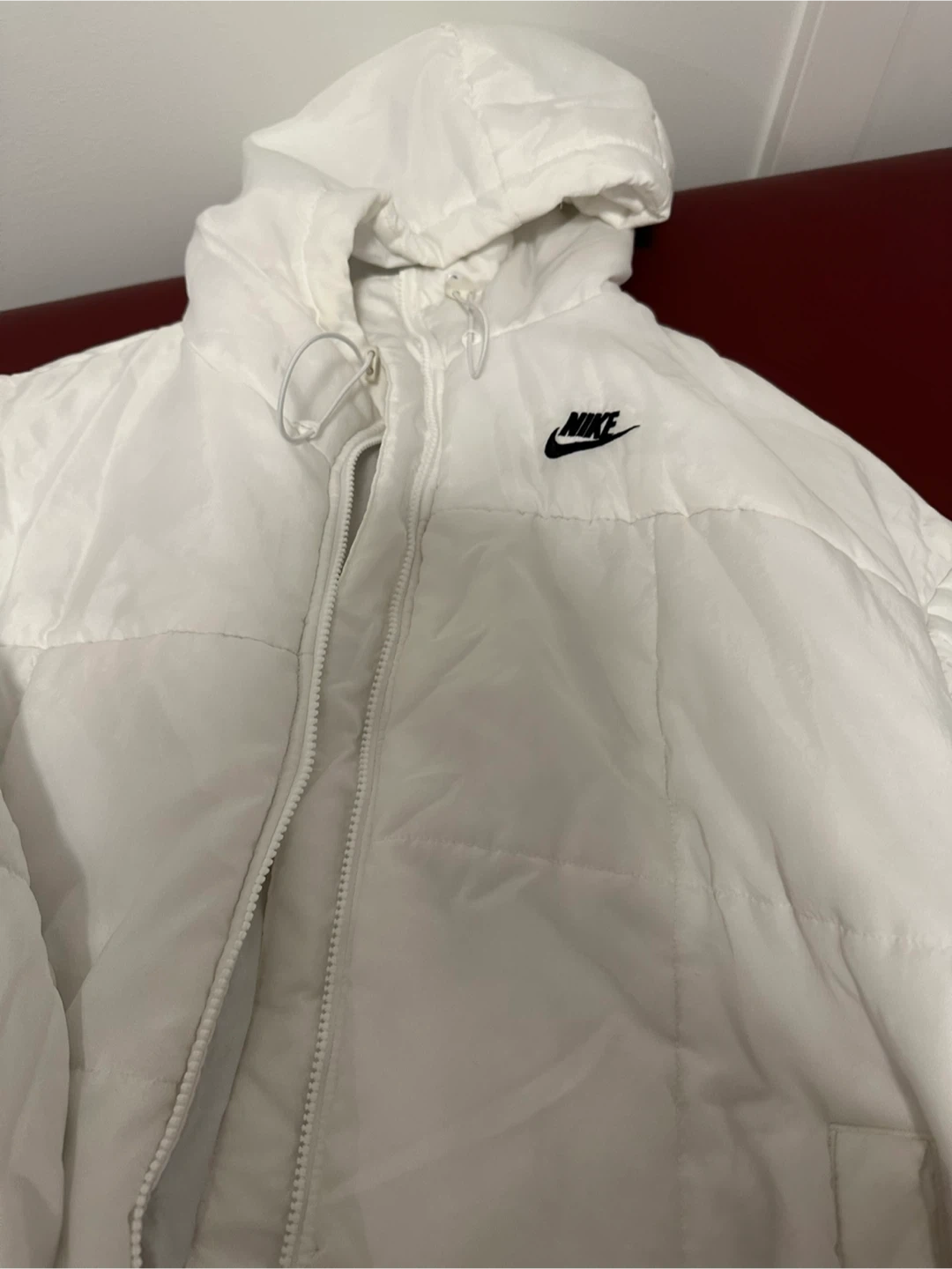 Selling a white Nike puffer jacket! It's in great condition and perfect for staying warm this winter. The jacket features the classic Nike logo and a comfortable, stylish fit no stains and very white size Large unisex