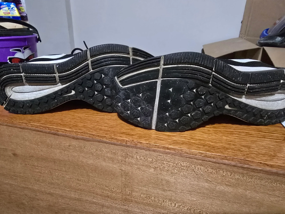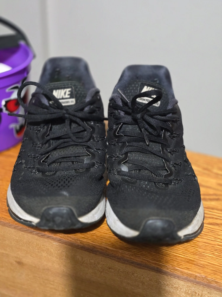 Selling a pair of Nike Zoom Pegasus 33 running shoes in men's size US 10. They're black with a white Nike swoosh. The shoes show some signs of wear, but still have lots of life left in them for running or everyday wear
