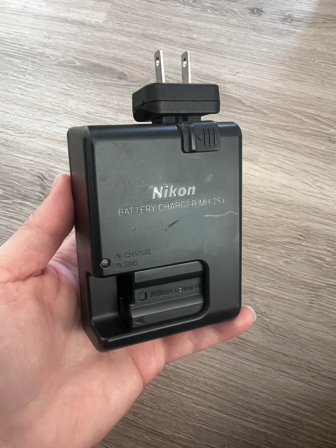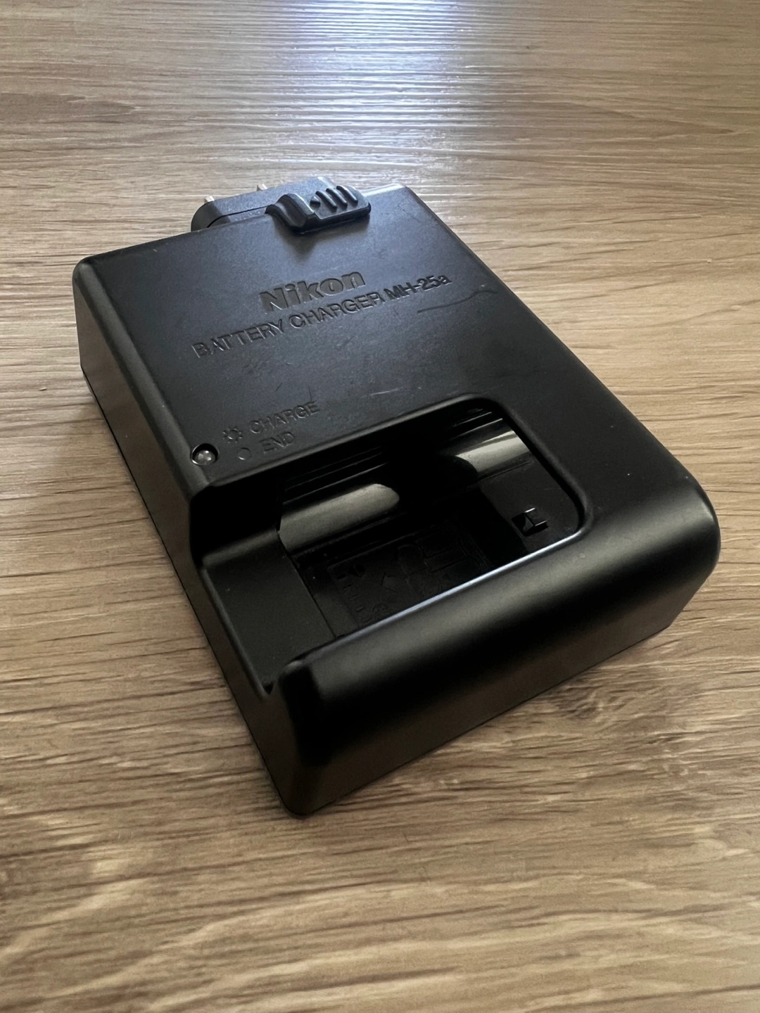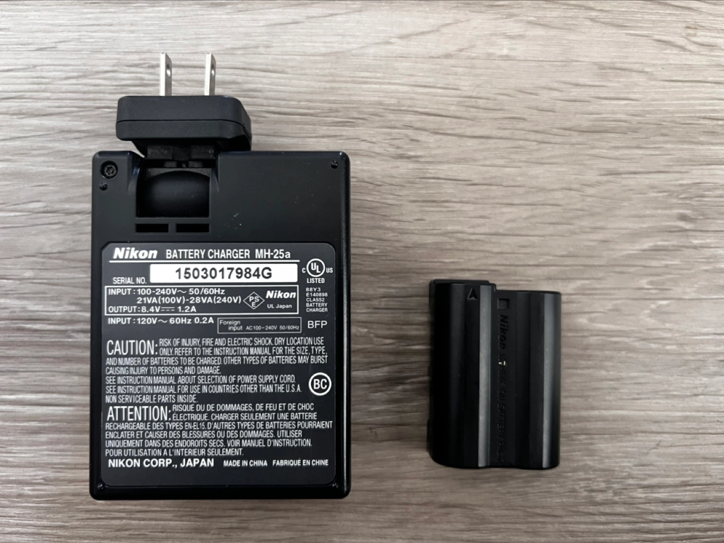 Nikon battery charger model MH-25a. Includes power adapter and battery. Used condition.