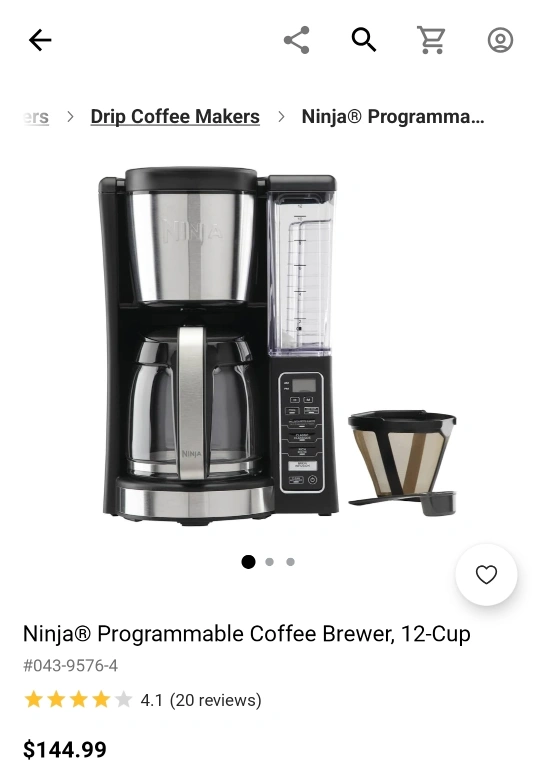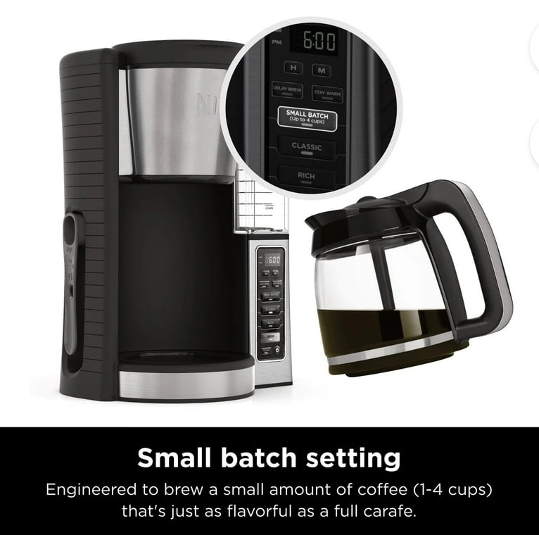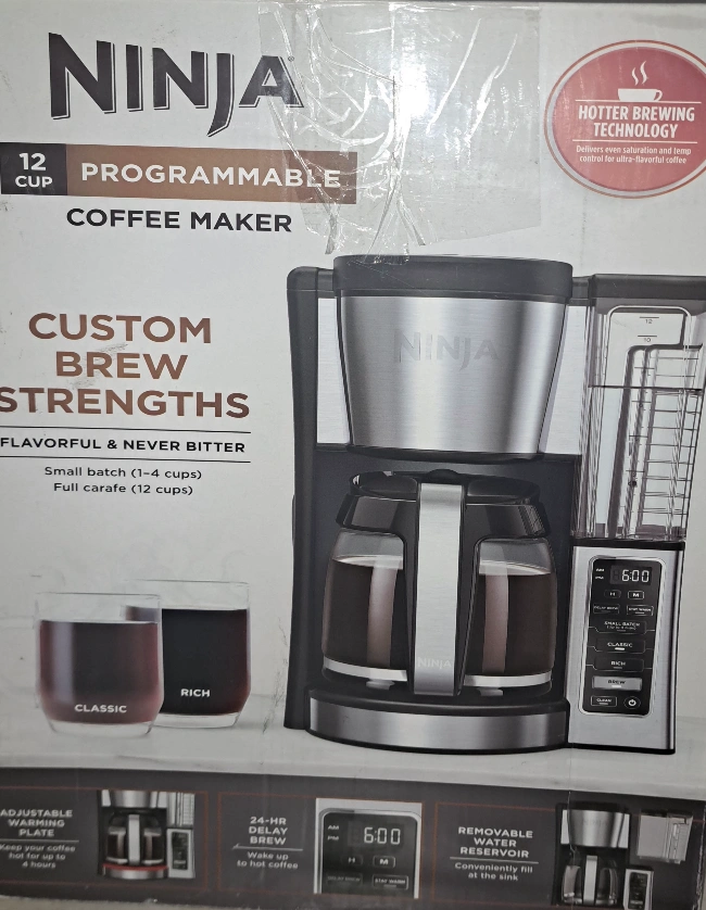Get your day started right with this Ninja 12-cup programmable coffee maker! It features custom brew strengths for flavourful coffee every time. The removable water reservoir makes filling easy, and the small batch setting is perfect for brewing 1-4 cups. Box is included! The original price is $145+tax https://www.canadiantire.ca/en/pdp/ninja-programmable-coffee-brewer-12-cup-0439576p.html my price is $56