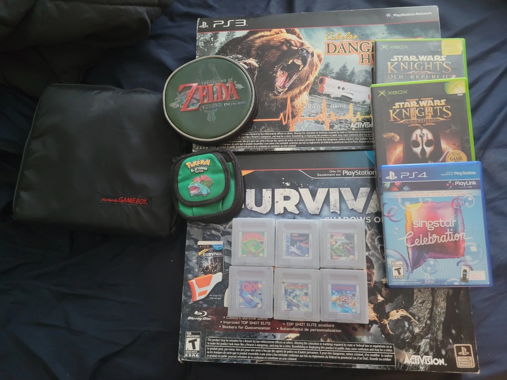 Selling a collection of Nintendo Game Boy items! Includes a Game Boy carrying case, some classic Game Boy games, and other games for various consoles like Xbox and PlayStation Cabela Hunt games are new. everything else is used. $50 for the lot, great deal for reselling.