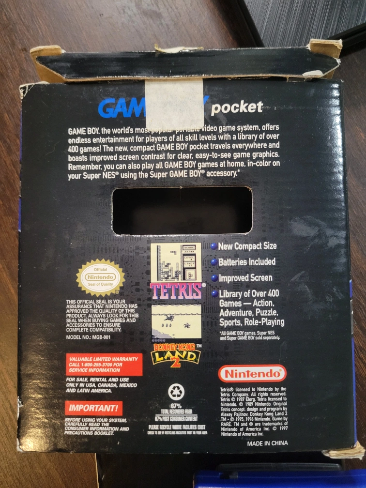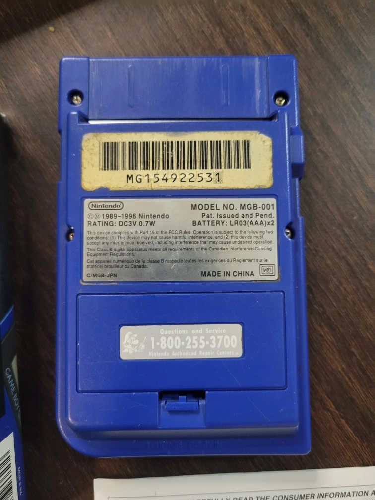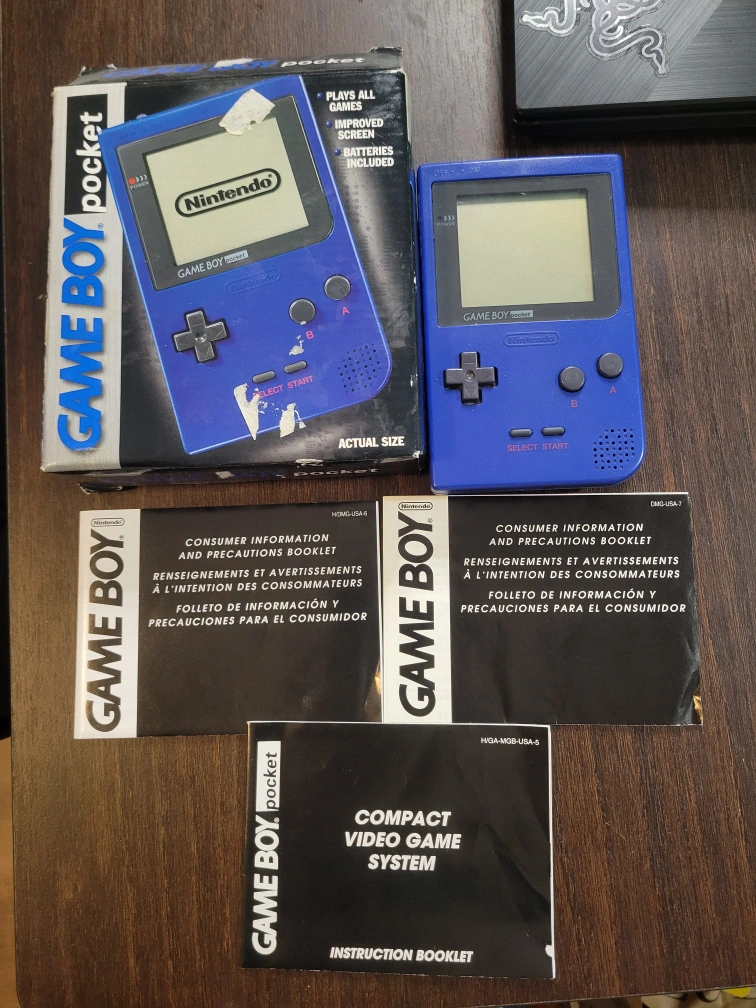 Blue Game Boy Pocket. Complete with box, manual, and batteries. Plays all Game Boy games. Improved screen. Model number MGB-001. Runs well and has everything you would have gotten when buying it brand new. Any questions just ask. $130 obo