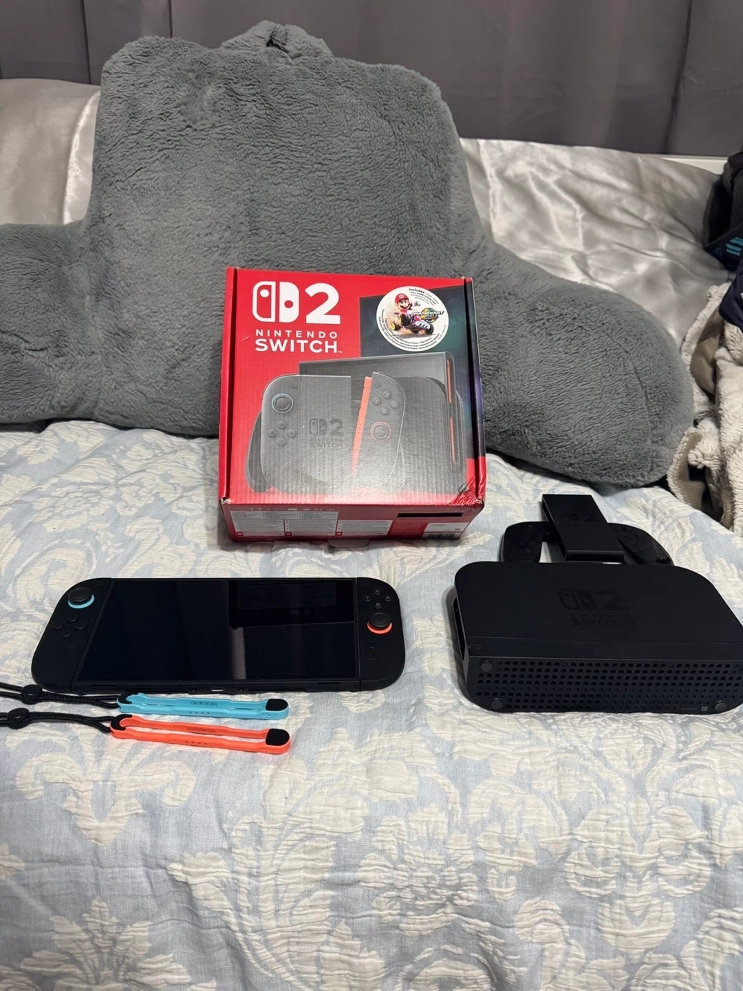 Selling a Nintendo Switch 2 model. It comes with the original box and all included components. It's in great condition and ready for a new home! Has a glass screen protector on and mario kart is not included