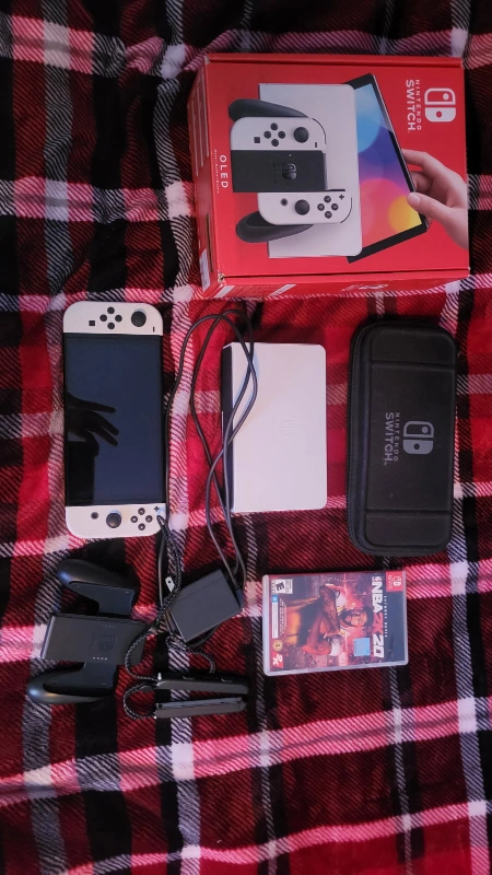 Selling a Nintendo Switch OLED in white! Included are the console, dock, Joy-Cons, charger, a carrying case, and the game NBA 2K20