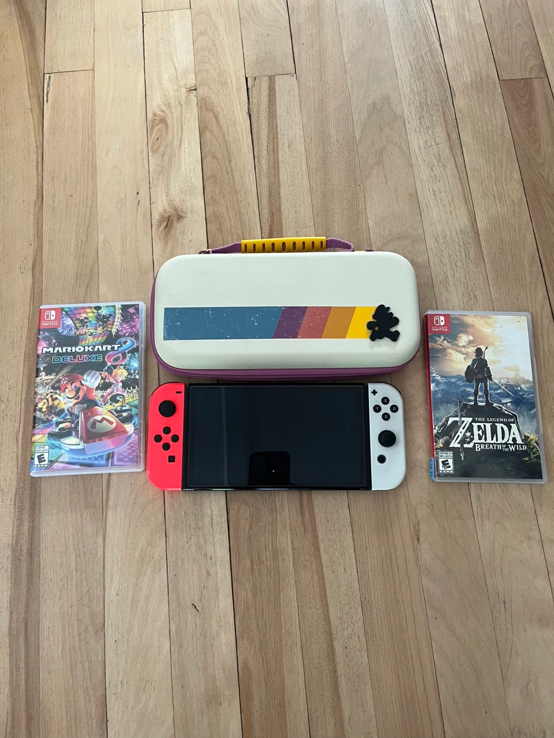 Selling a Nintendo Switch OLED model in great condition! Included are the games Mario Kart 8 Deluxe and The Legend of Zelda: Breath of the Wild. Also comes with a carrying case to keep everything safe and organized. Includes everything found in the box. A used Oled at EB Games is $400 alone!