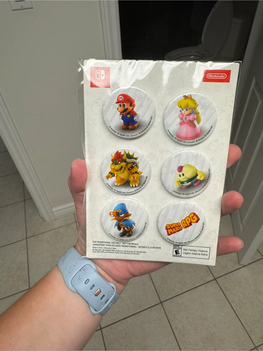 Selling a set of Nintendo Switch Super Mario RPG buttons! These are for promotional use only and not for resale. They feature Mario, Princess Peach, Bowser, and other characters from the game. Perfect for any Super Mario fan!
