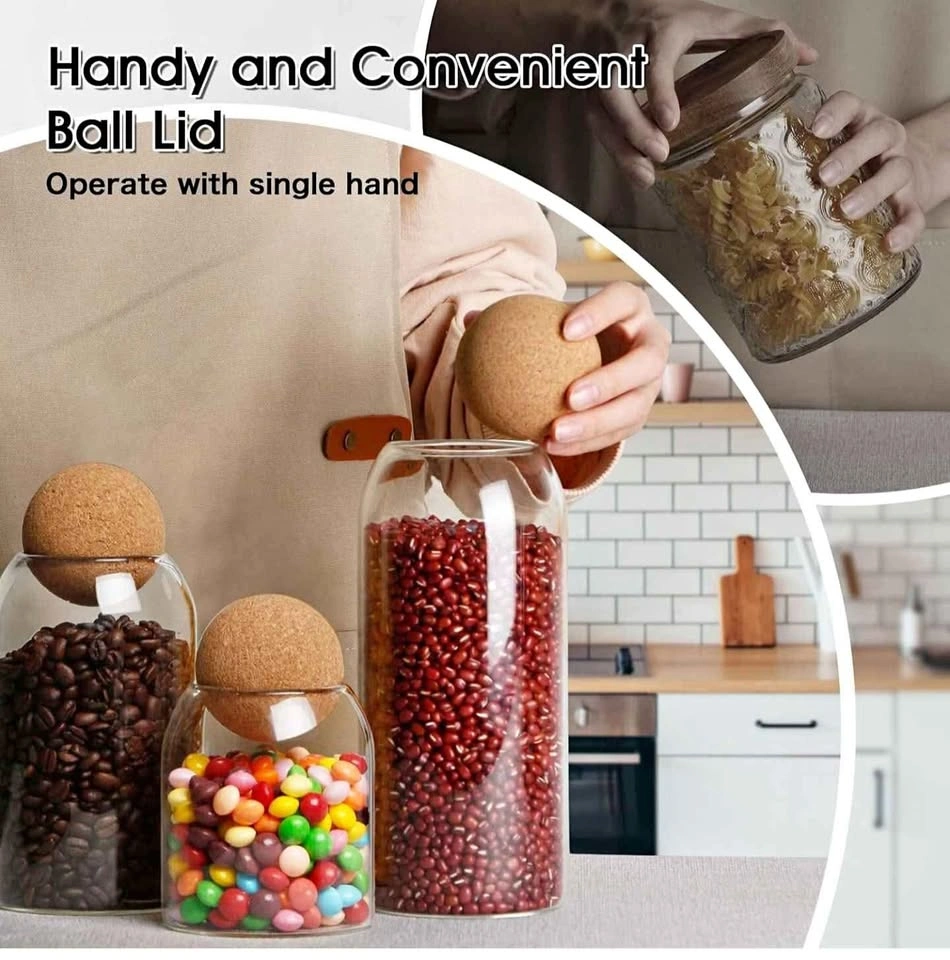 High-quality glass jars made of high boron silicon glass, ensuring durability. Transparent, allowing you to easily identify the contents inside. Cute and decorative design, making them a perfect addition to your kitchen or home decor. The round shape and wood ball lid add a touch of fashion and uniqueness. The set includes 3 glass jars in different sizes: 500 ML/17Oz, 800 ML/27Oz, and 1200 ML/41Oz. This variety of sizes allows you to store different quantities. Easy to clean. The smooth glass surface is easy to wipe clean, and the cork ball lid can be removed for thorough cleaning. Simply wash them with water, and they will be ready to use again. The wood ball lid can also be wiped clean with a damp cloth. Perfect for storing food items such as dry fruits, nuts, spices, and more, but they can also be used for other purposes like organizing small items or displaying decorative items.