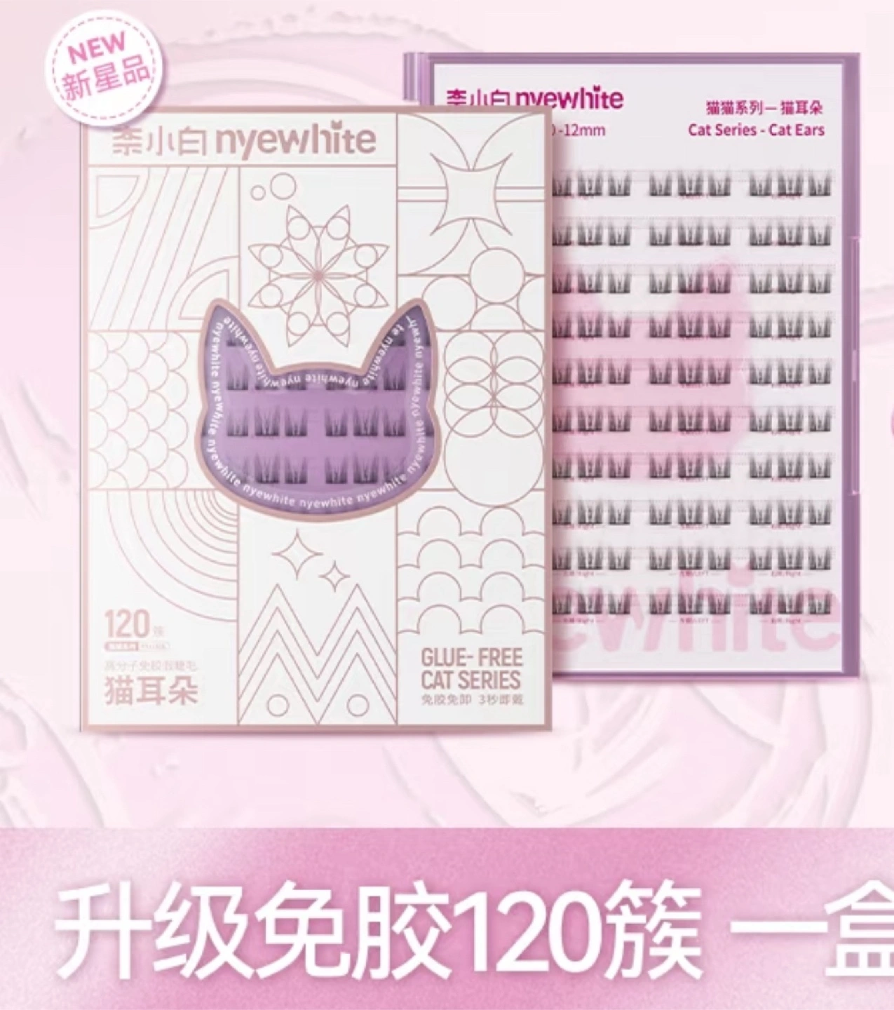 Selling a set of nyewhite Glue-Free Cat Series eyelashes. These are the cat ears style, and they come in a box that contains 120 clusters. They're glue-free for easy application! free tool when purchase of 2 items