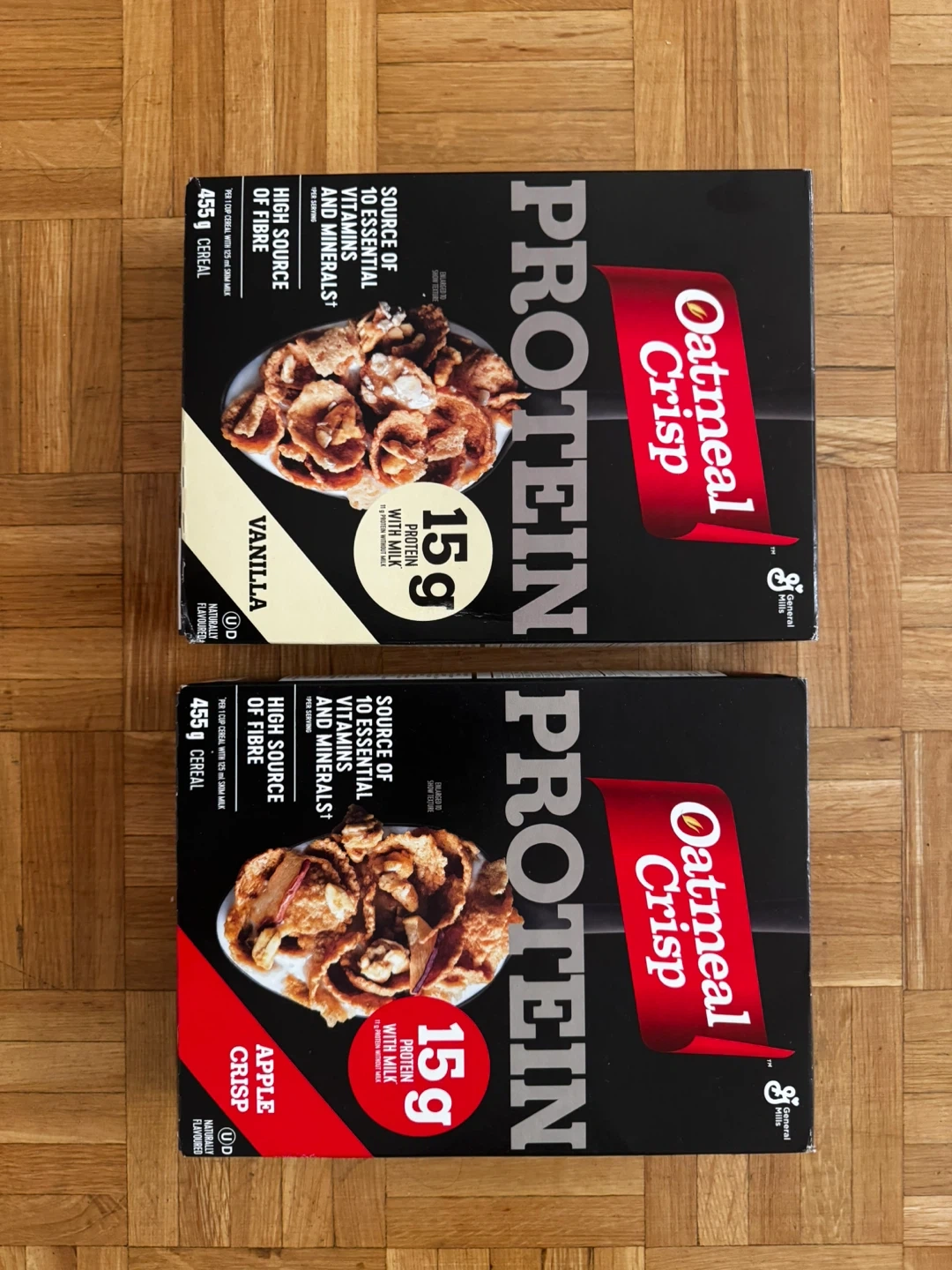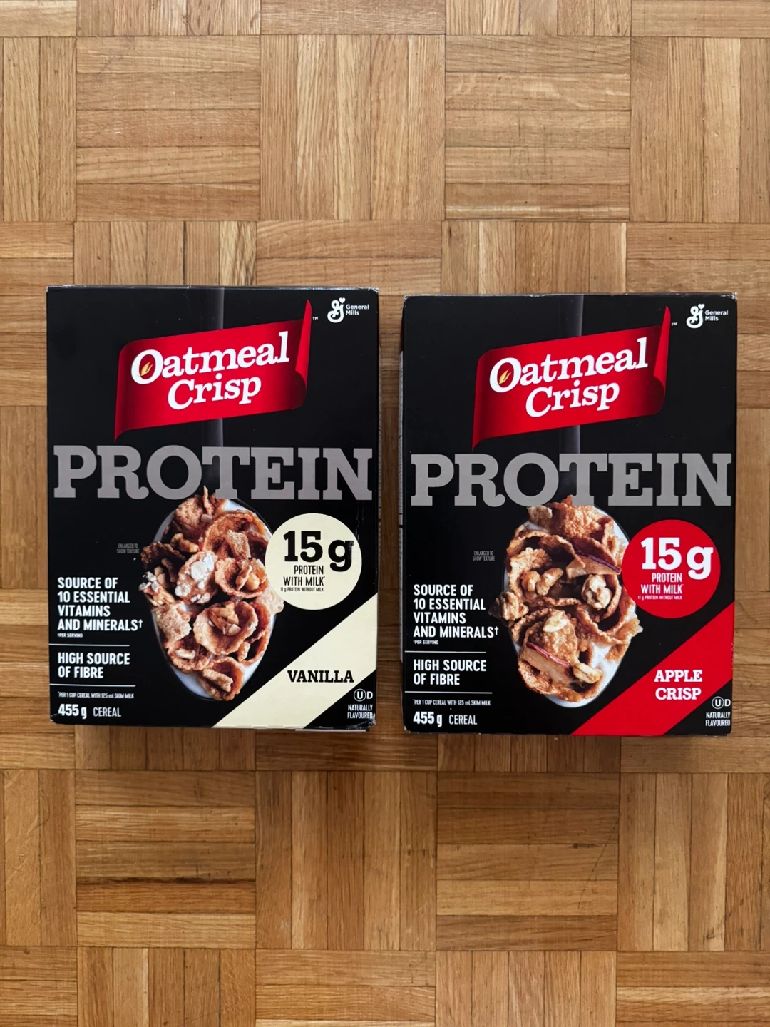 Selling two boxes of Oatmeal Crisp Protein cereal! One is Vanilla flavour and the other is Apple Crisp flavour. Both are 455g cereal and a high source of fibre!