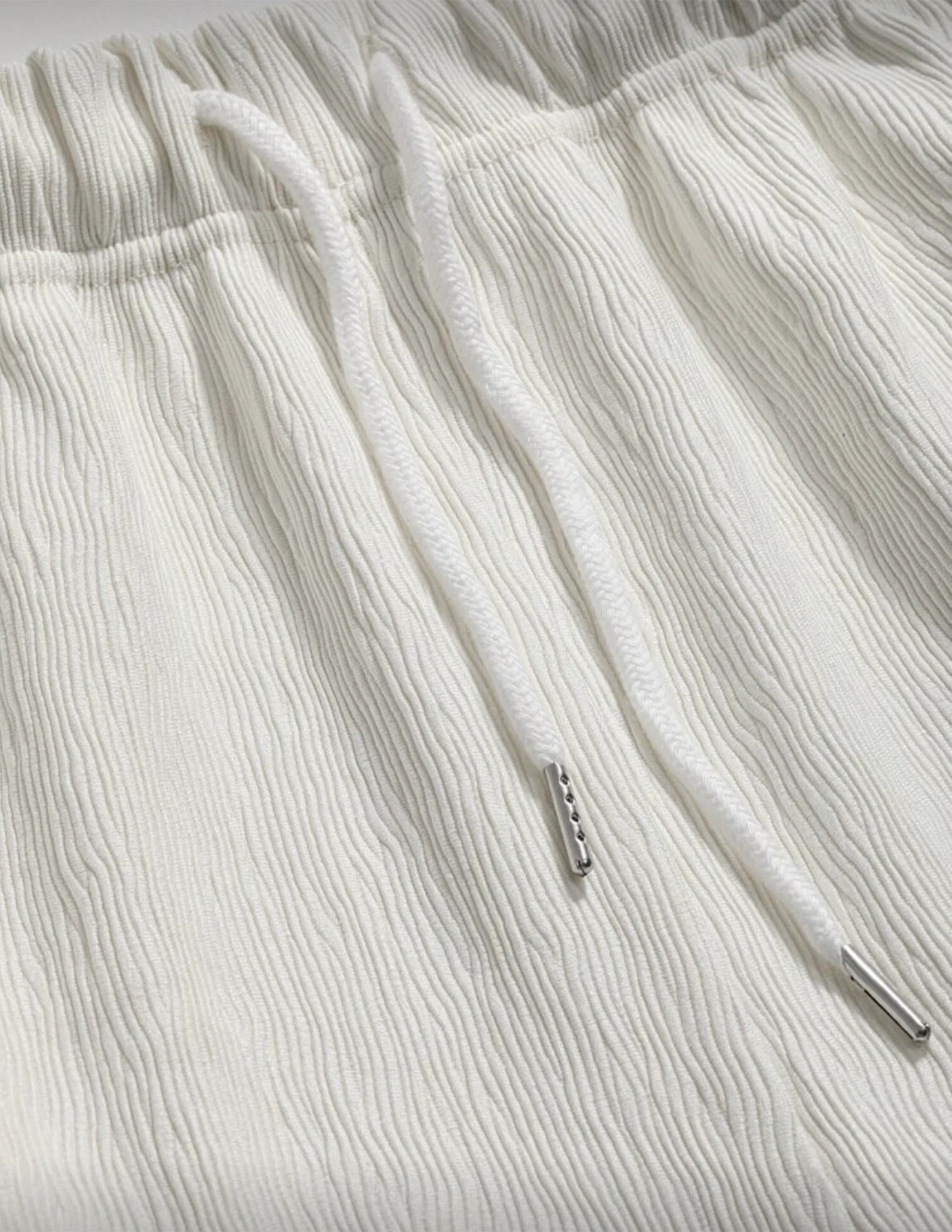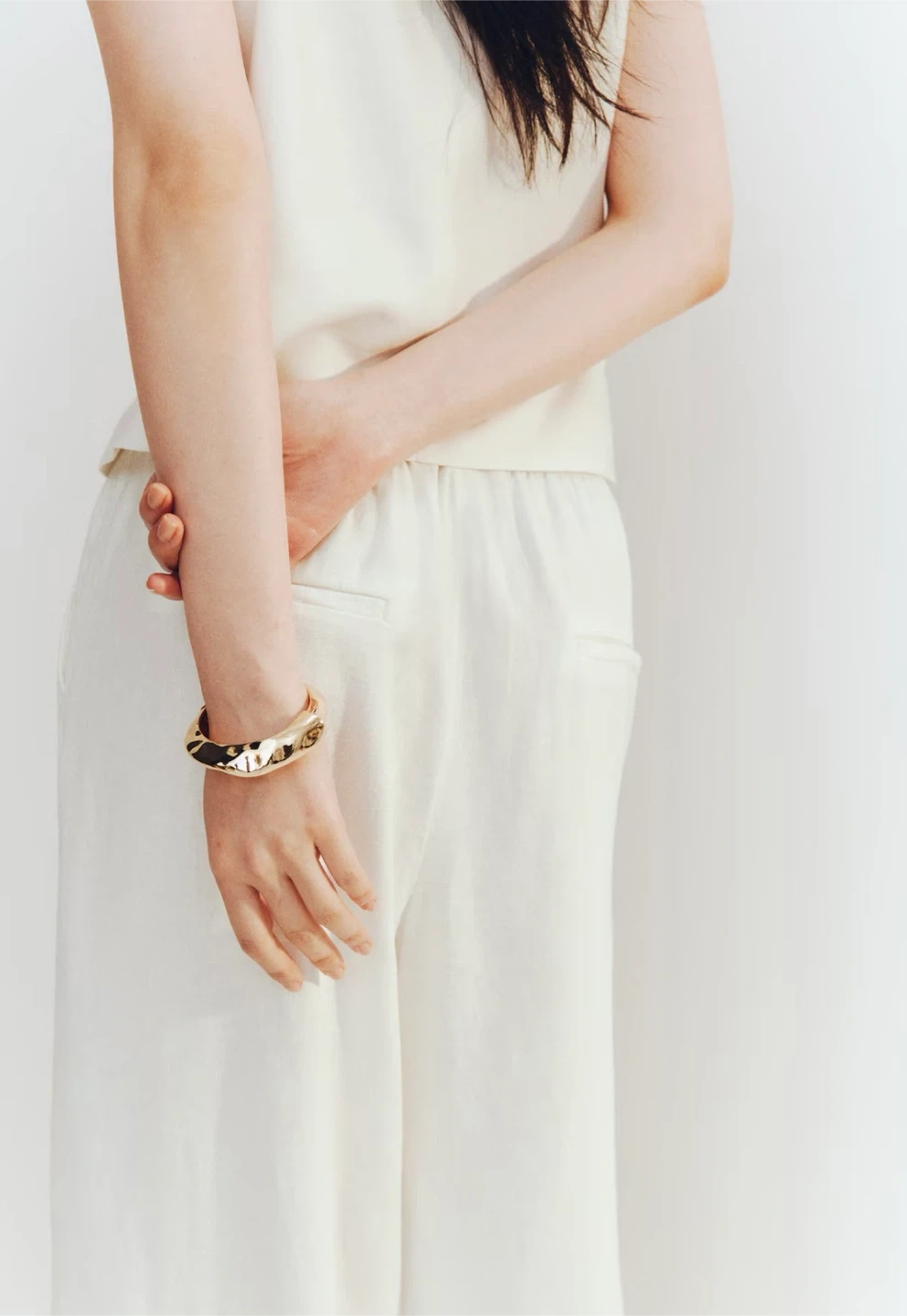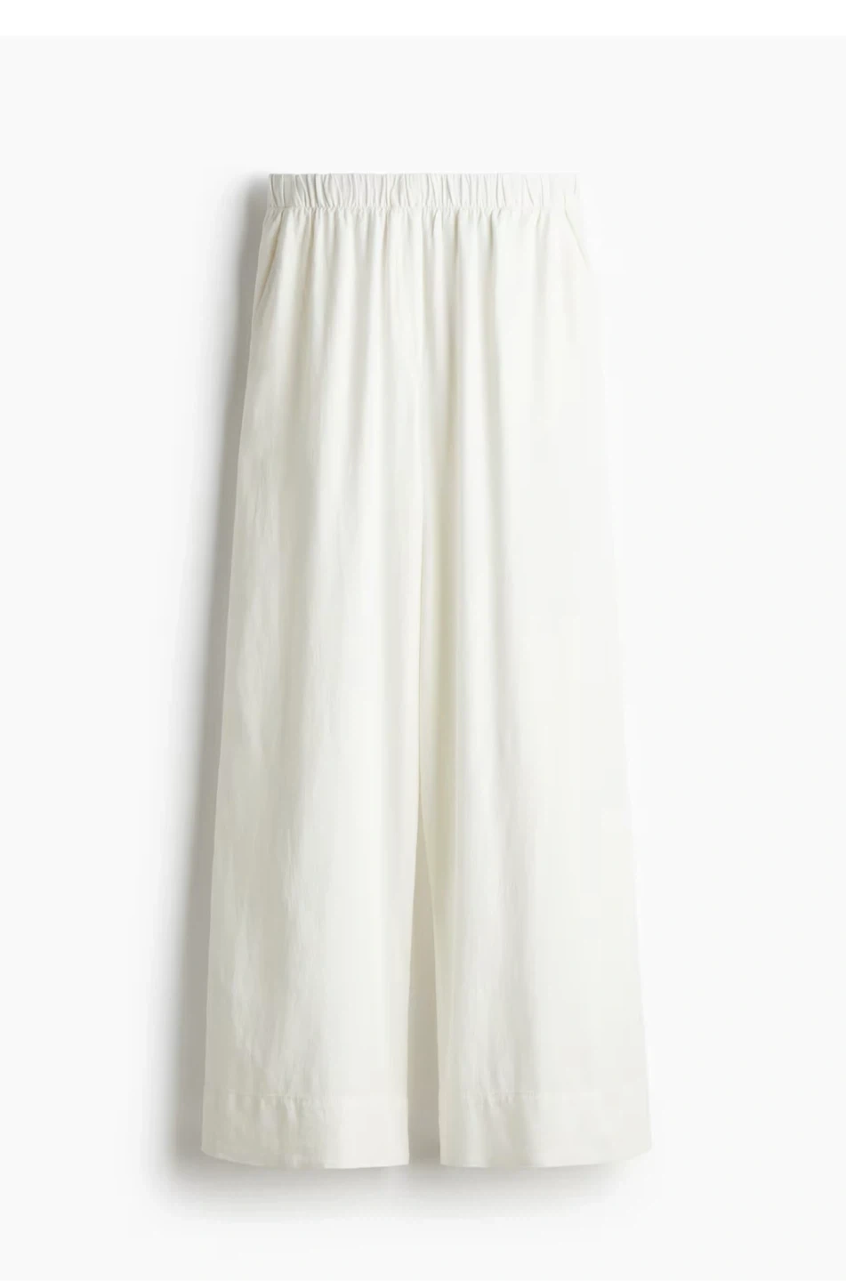 Selling a pair of wide-leg pants in an off-white colour. They're made from a comfortable linen blend, perfect for warmer weather. The pants have a relaxed fit and an elastic waistband for easy wear. Great for a casual or dressed-up look!