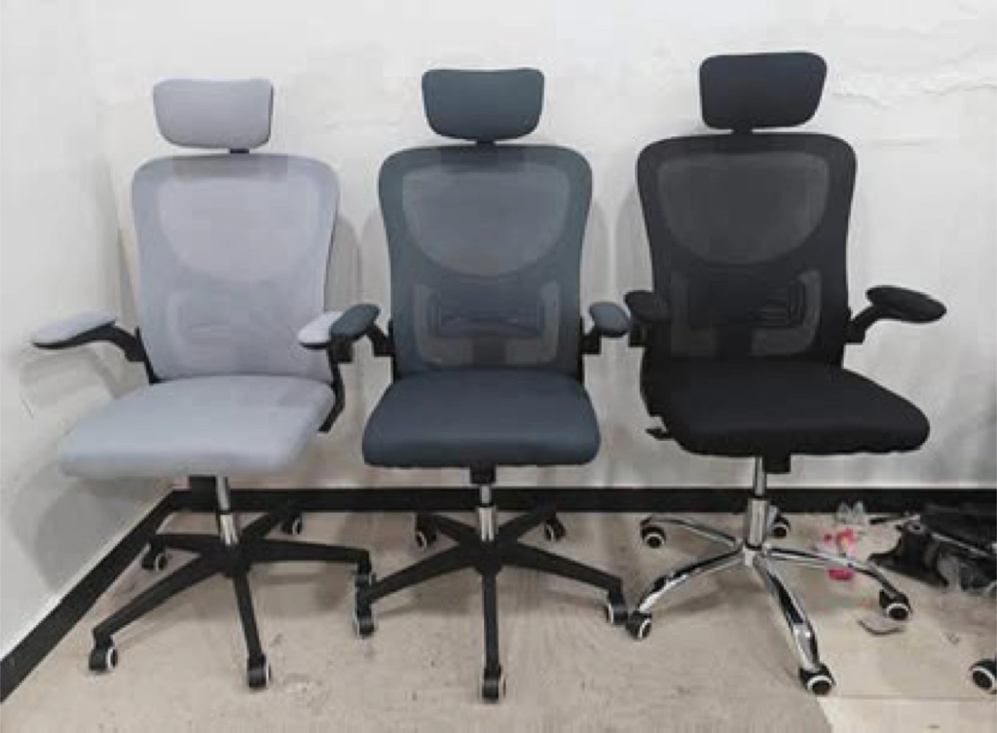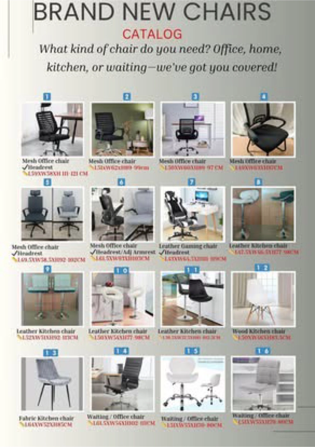 Looking to add a comfy chair to your office or home? This chair would be perfect! Brand new and ready for a new home. Many models are avaliable in stock, comes in mesh and/or leather. Ask for details. Mesh model: Brand-new ergonomic sturdy mesh office chair. Comes with a comfy Flipping Armrest, a firm Headrest, a great lumbar support, breathable mesh, height adjusting functionality, tilt back recliner option, 360-degree swivel, class 3 certified gas lift, floor friendly nylon casters, chrome or nylon base and thicker elastic cushion for your comfortability. Leather model: Brand-new ergonomic sturdy PU Leather office chair or waiting room chair. Comes with a great lumbar support, Higher backrest, height adjusting functionality, tilt back recliner option, 360-degree swivel, class 1 certified gas lift, floor friendly nylon casters, chrome or nylon base and thicker elastic cushion for your comfortability. Specifications ►Main Features: Ergonomic – Lumbar support - Flipping Armrest - Headrest - Height adjustable – Recliner (tilt back) – swivel 360 for multitasking convenience - sturdy backrest & seat - breathable mesh - Class 3 upgraded Gas Lift. ►Materials: Mesh - Foam – PP plastic frame – chrome or nylon base - nylon casters. ►Color: Black, Gray. ►Condition: Brand-new in a box. ►Base: Solid & Stable chrome or nylon bases of 320mm radius. ►Floor-Friendly universal nylon casters.