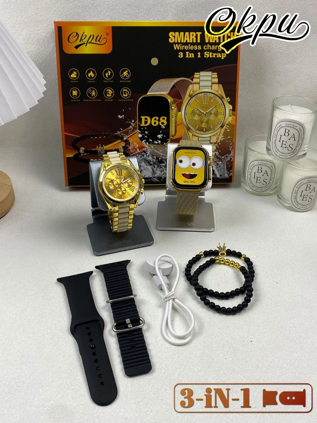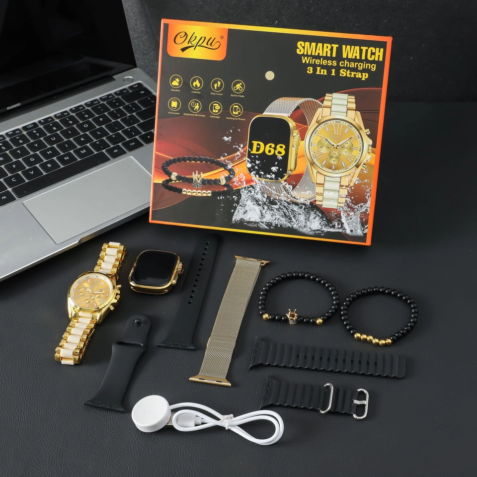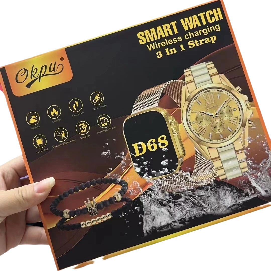 Selling a brand new Okpu Smart Watch and Fitness Tracker D68! This stylish gold smartwatch comes with 3 interchangeable straps to suit any occasion. Answer Calls, Music, Pedometer, Blood pressure and Blood Oxygen monitor and multiple sports modes. It includes wireless charging and comes in its original box with all components. A great gift idea!