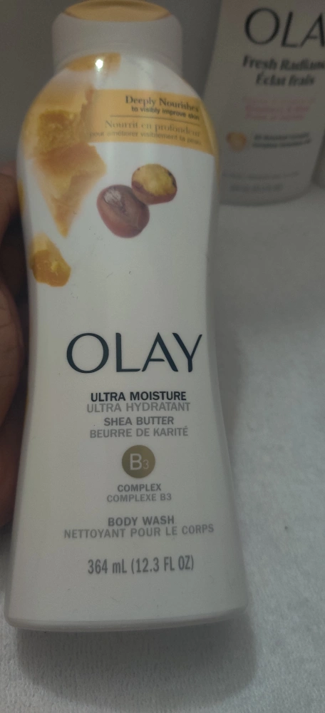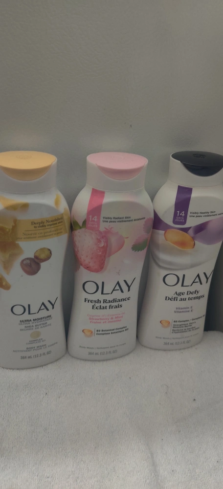 Selling three bottles of Olay body wash. One is Age Defy, another is Fresh Radiance, and the last one is Ultra Moisture. Each bottle contains 364 mL (12.3 FL OZ).