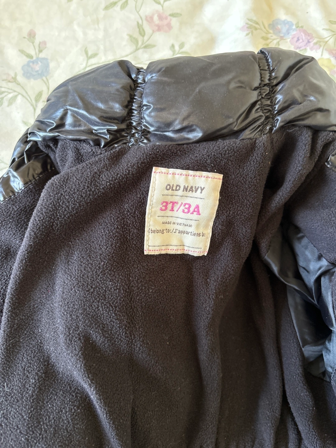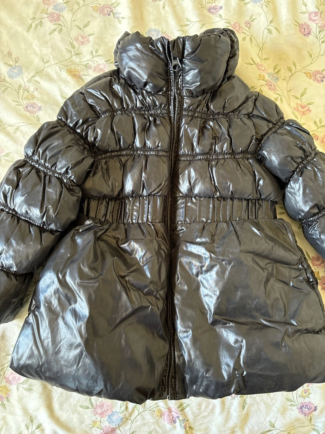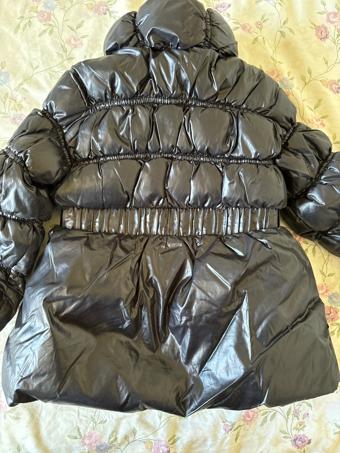 Black puffer jacket with a belt. Pet Free and Smoke Free Home Pick Up Only
