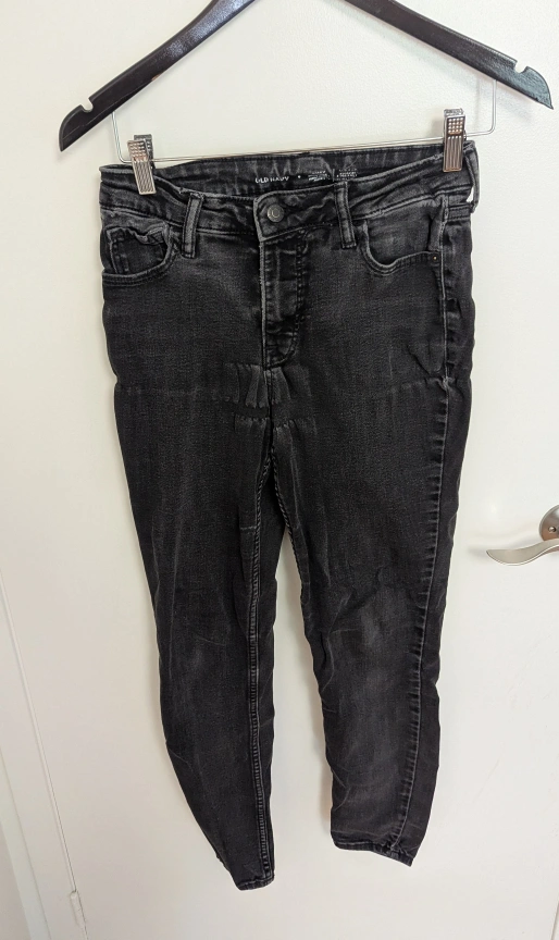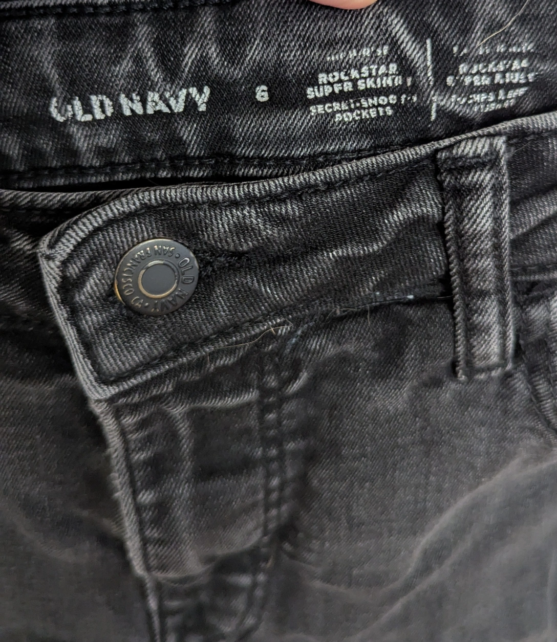 Selling a pair of Old Navy Rockstar Super Skinny jeans in a stylish black wash! They're a size 6 and in great condition. These jeans feature secret smoothing pockets for a flattering fit. Perfect for everyday wear!
