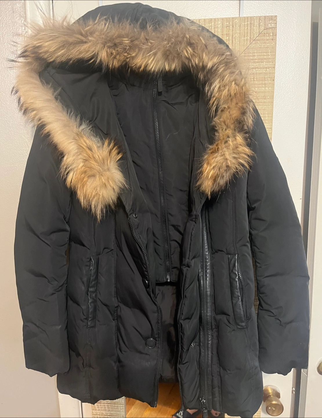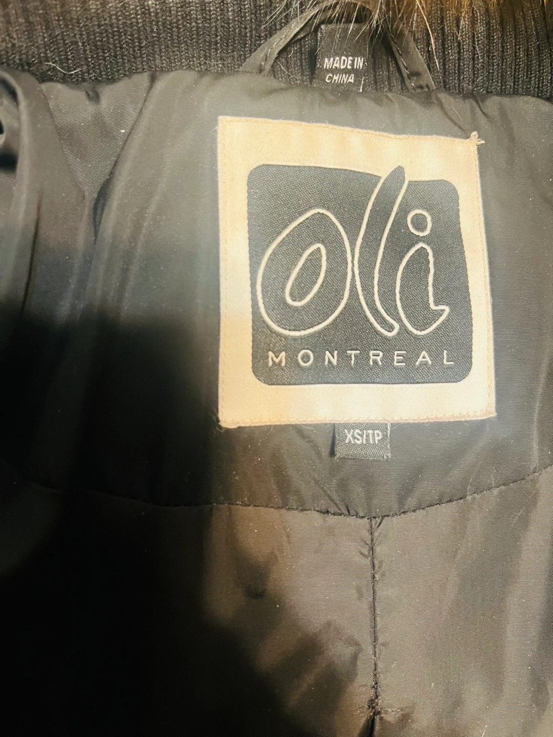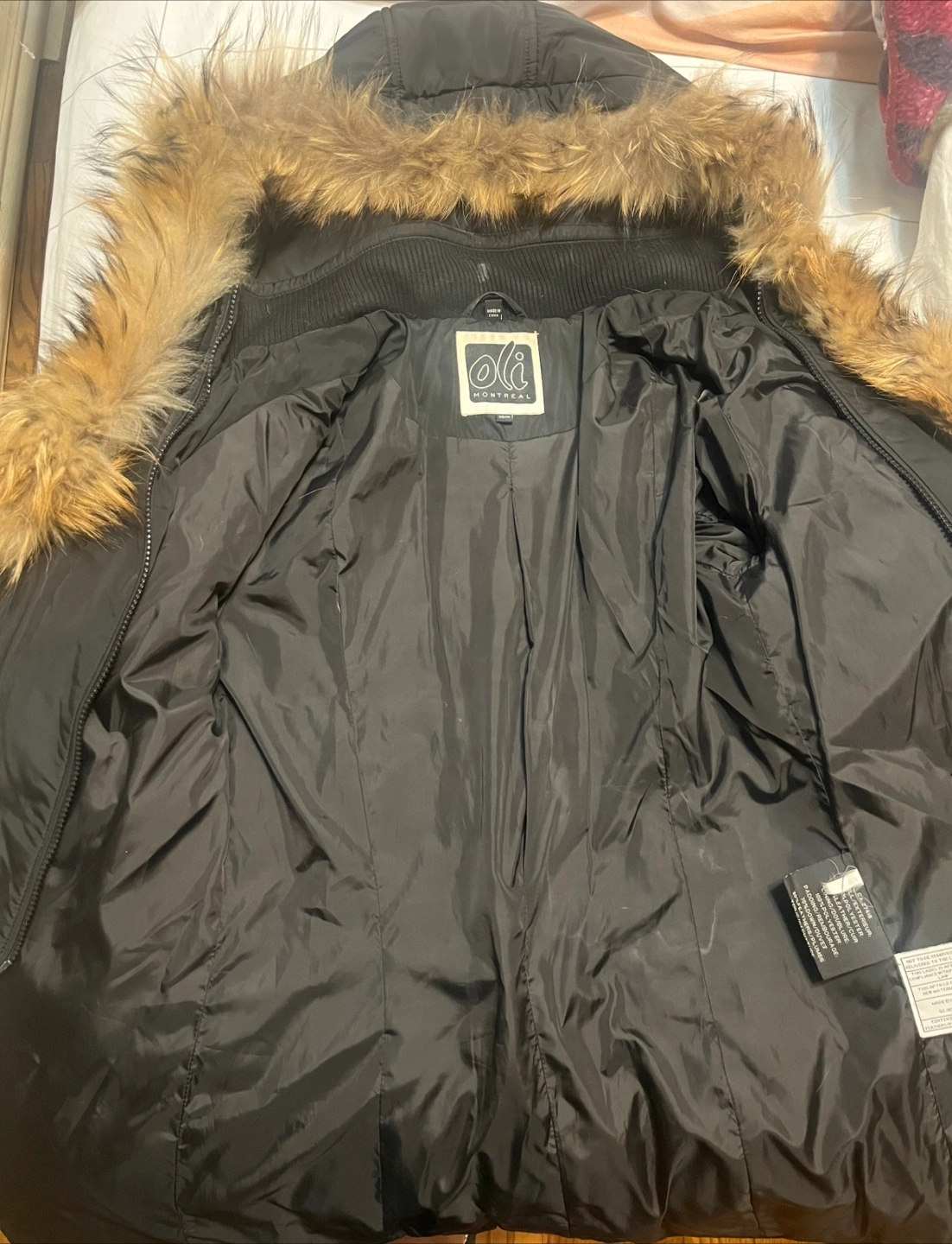 Here's a stylish black down parka from Oli Montreal! It's in great condition and ready to keep you warm this winter. The faux fur hood adds a touch of elegance, and the quilted design ensures even distribution of warmth. Perfect for those chilly Canadian days!