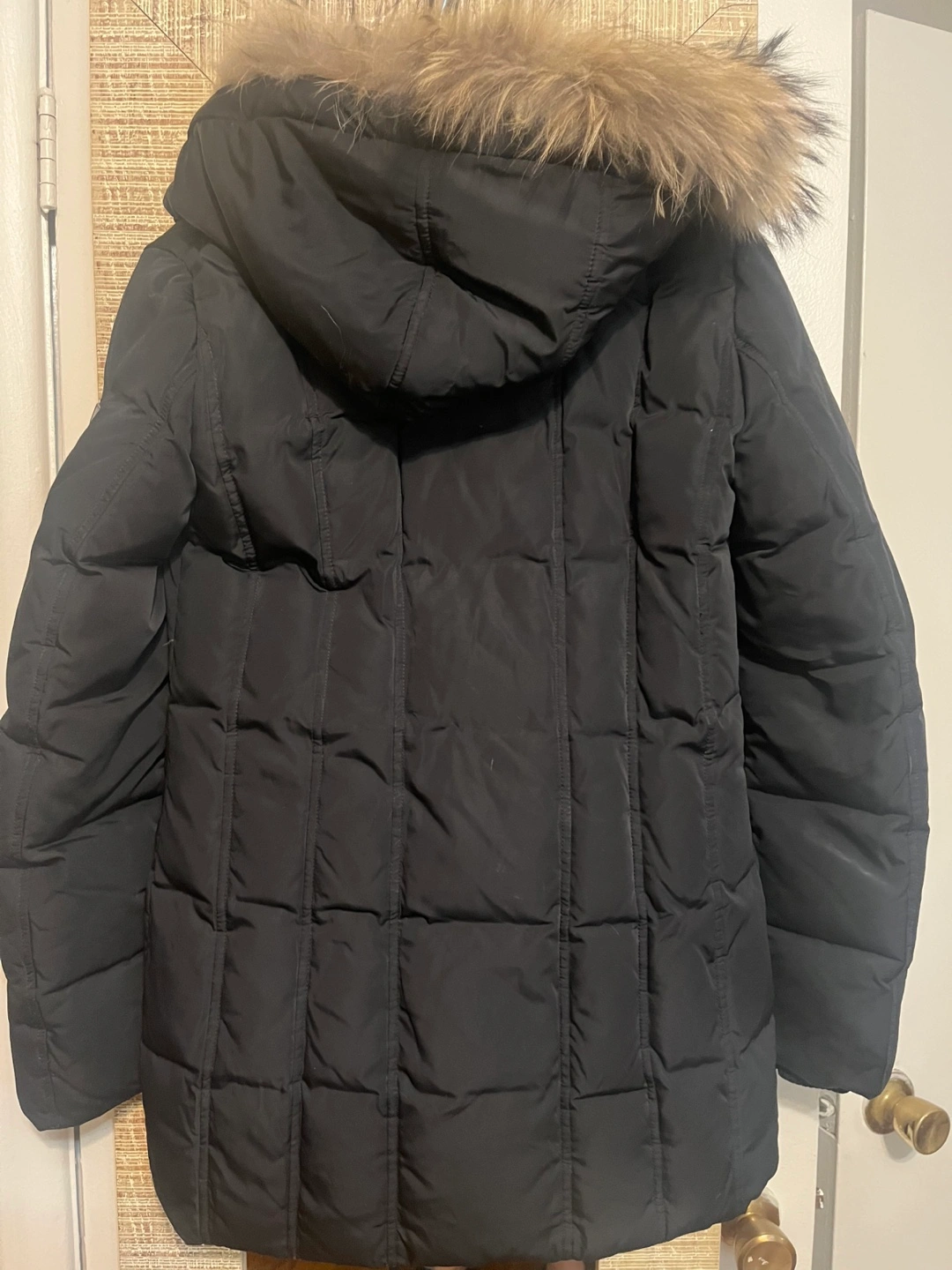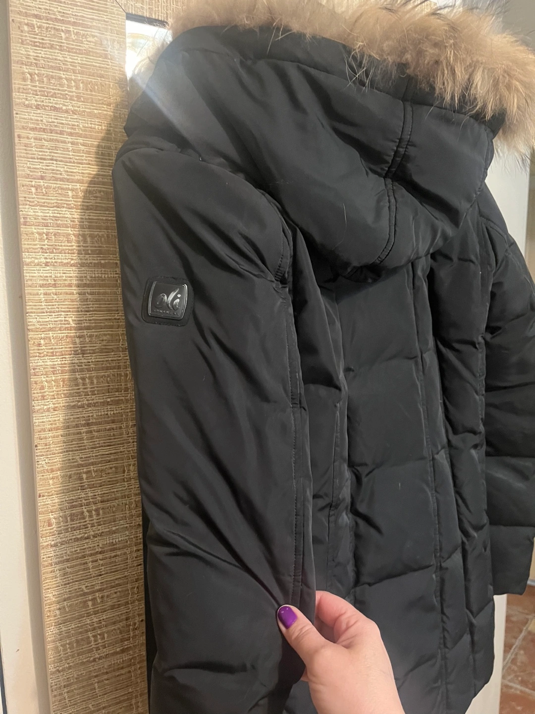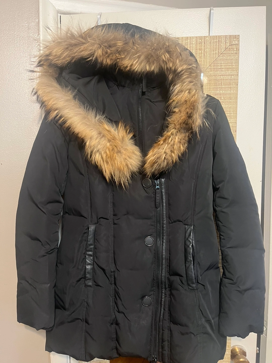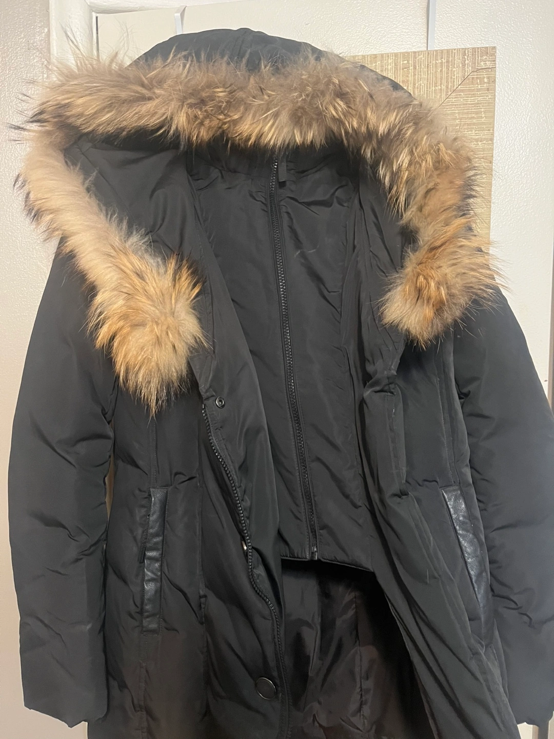 Here's a stylish black down parka from Oli Montreal! It's in great condition and ready to keep you warm this winter. The faux fur hood adds a touch of elegance, and the quilted design ensures even distribution of warmth. Perfect for those chilly Canadian days!