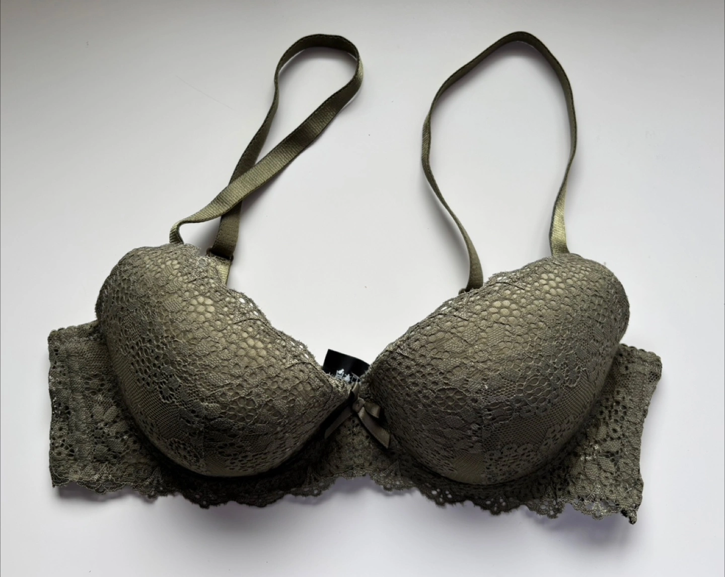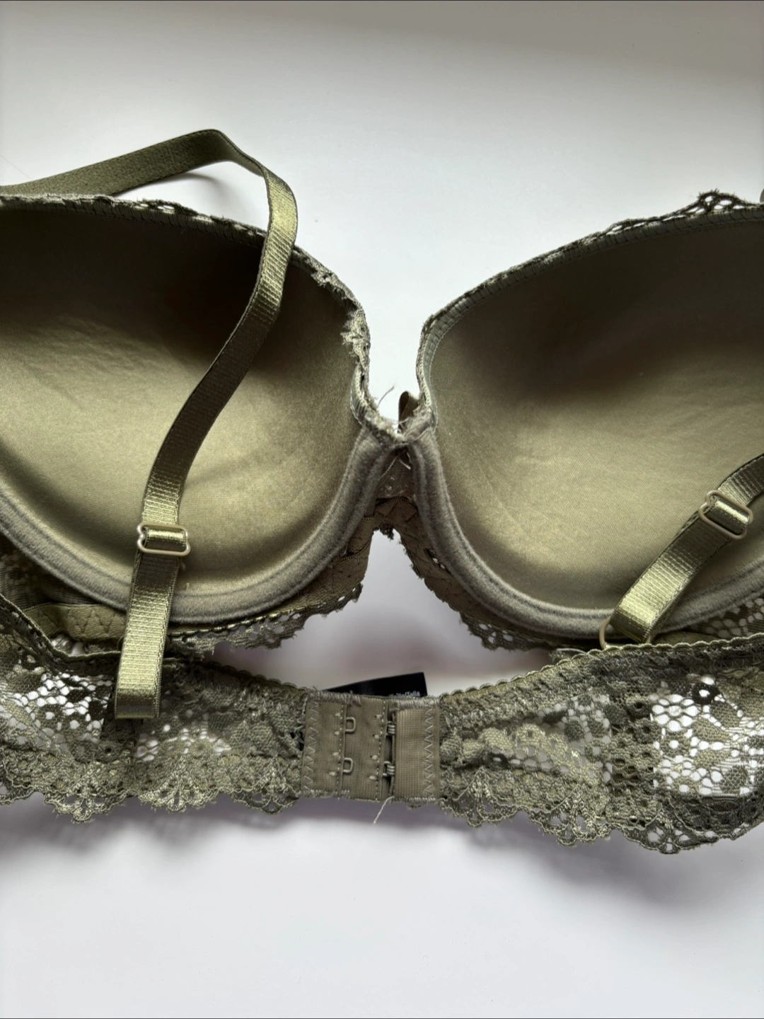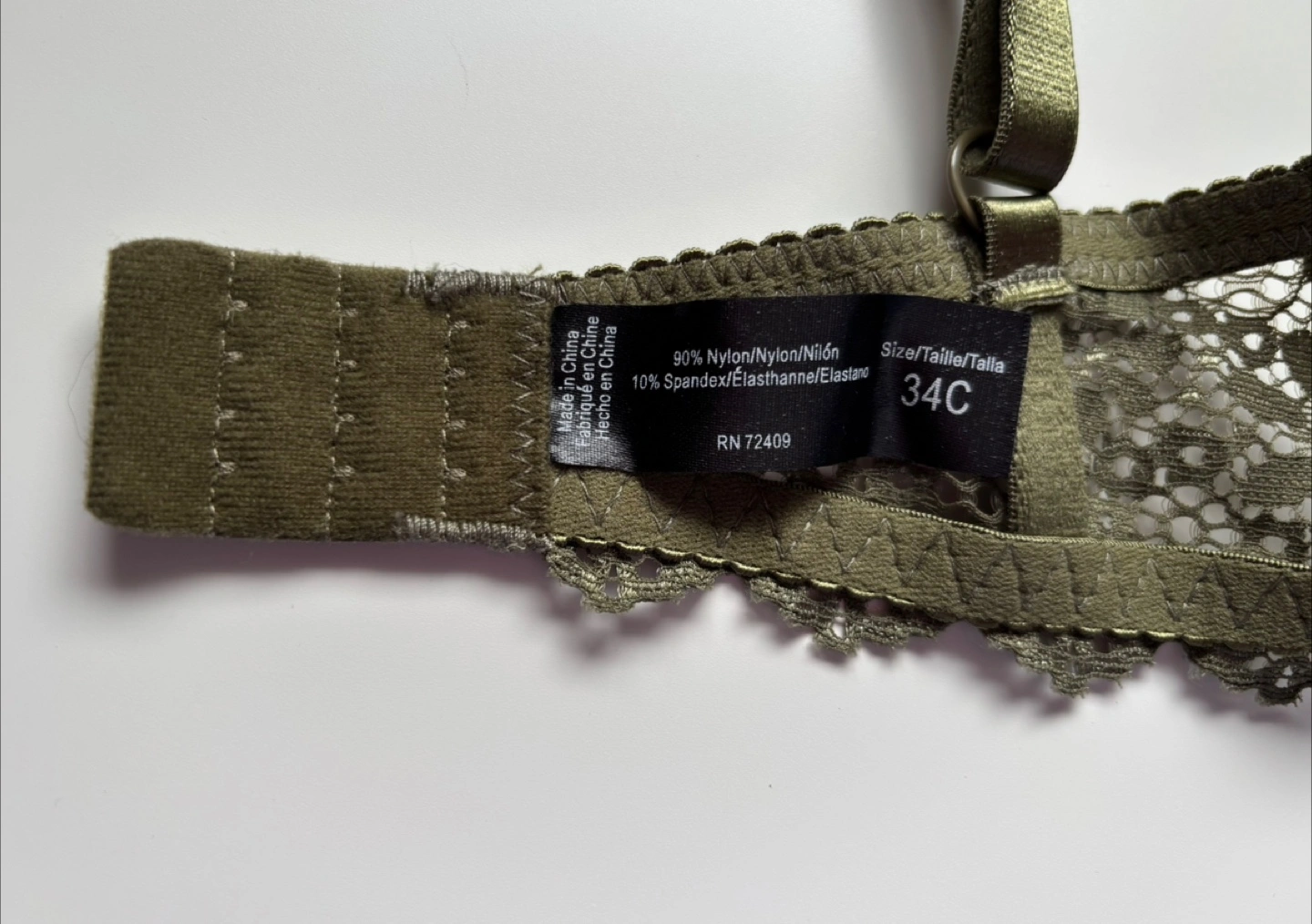 Olive green bra in size 34C. The material is 90% Nylon and 10% Spandex. It's in great condition and ready for a new home!