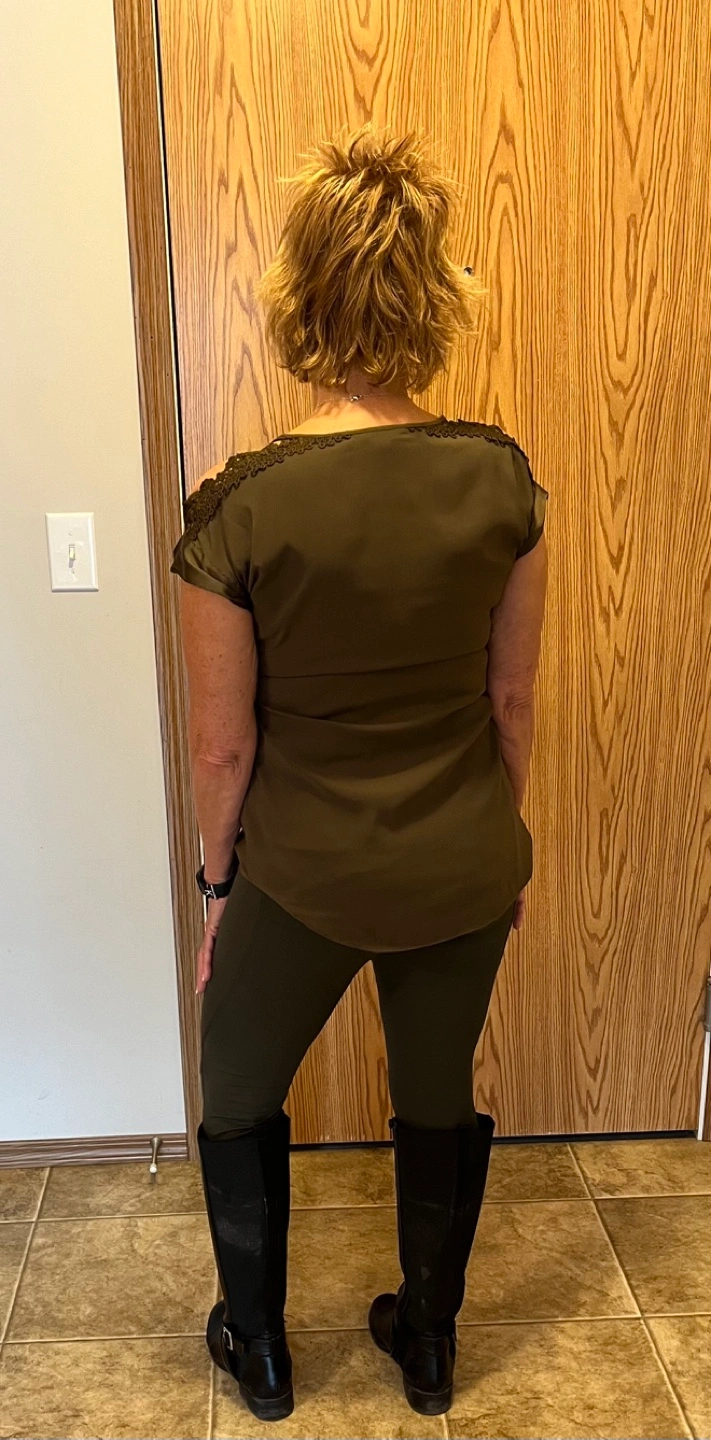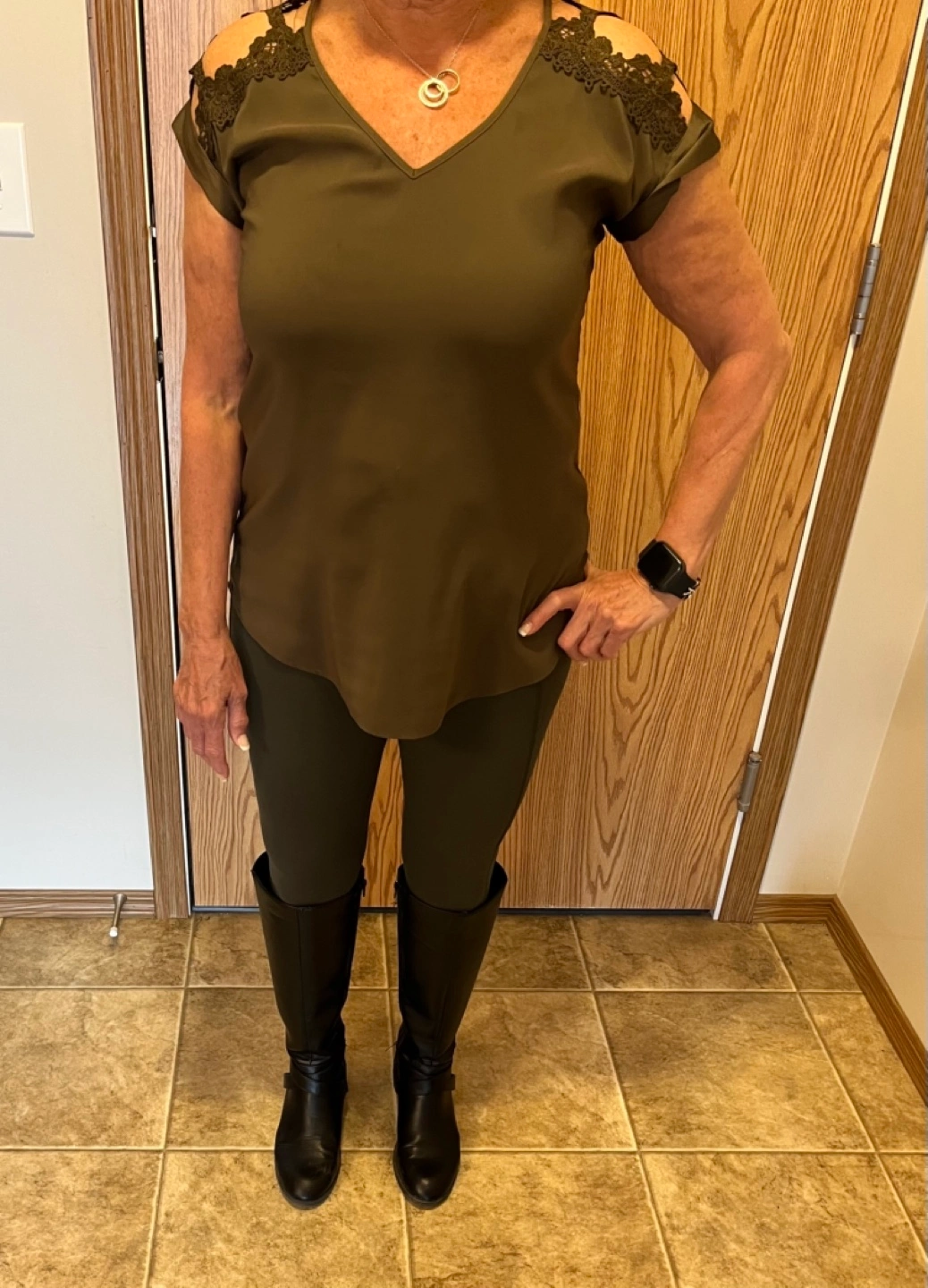 Women's olive green blouse. Features cold shoulder detail and lace accents. Short sleeves. V-neck. Relaxed fit. Great for casual or dressed-up occasions.