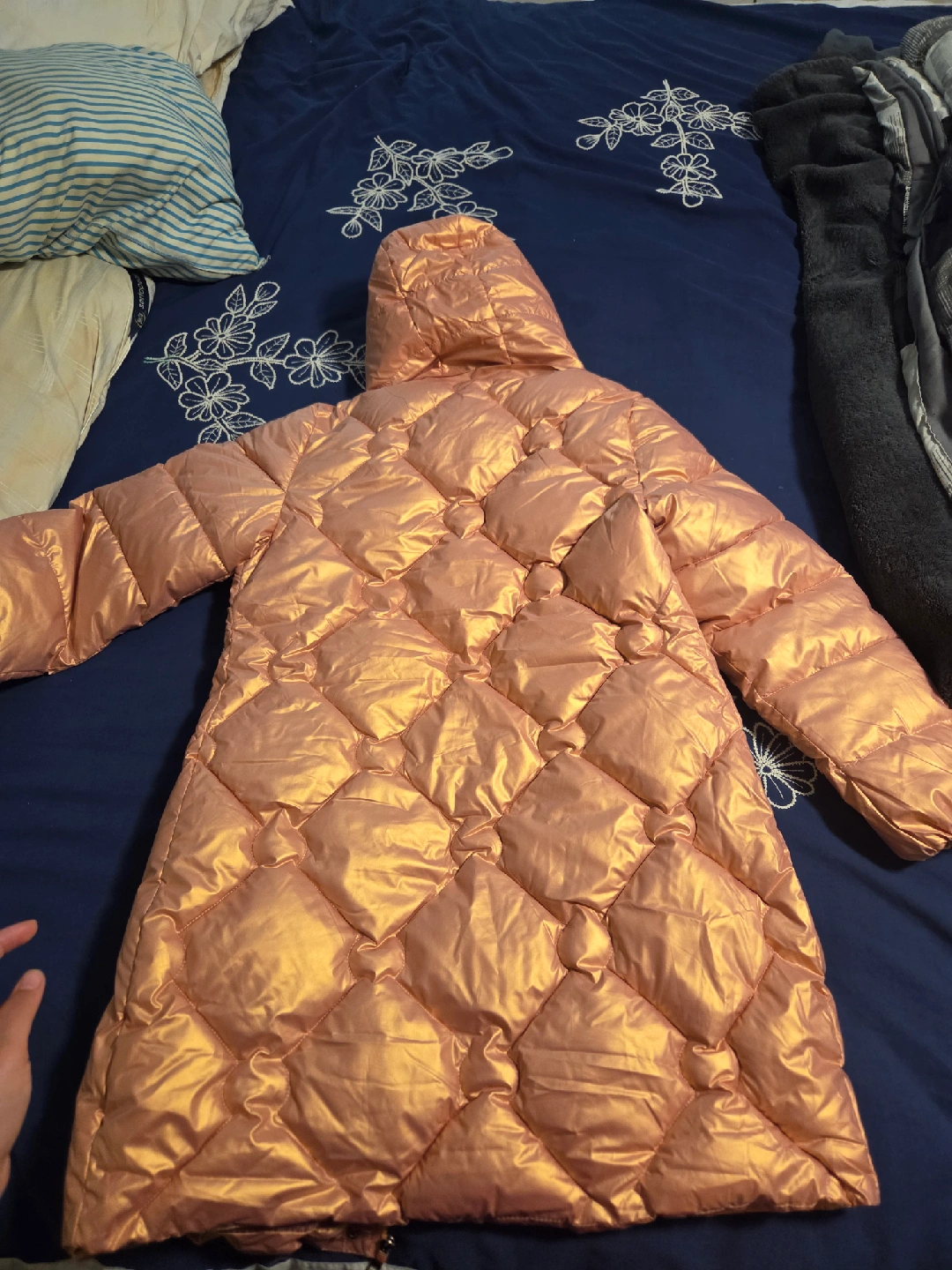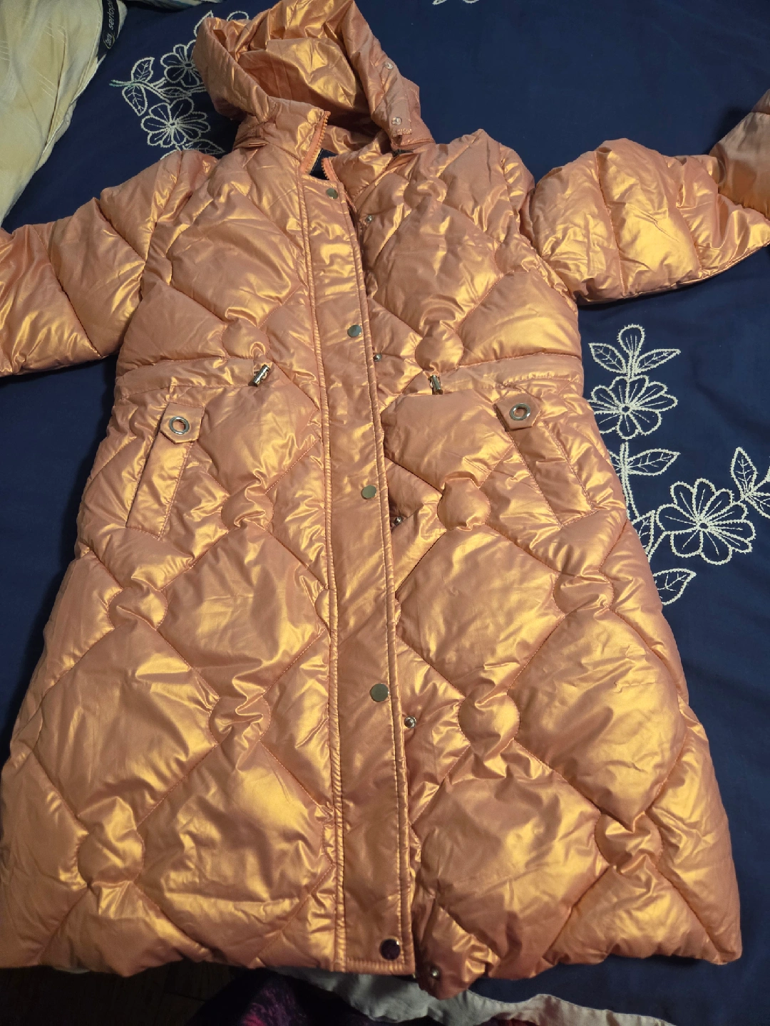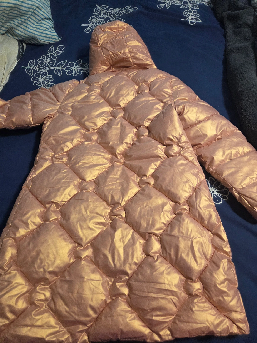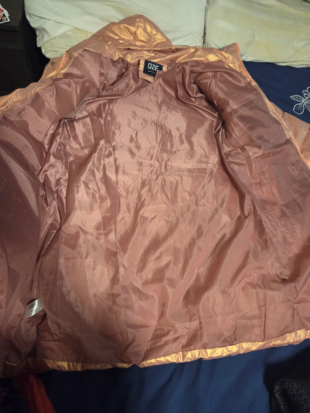 Selling a beautiful rose gold puffer coat from ONE Clothing! It's in great condition and ready to keep you warm this winter. The quilted design is super stylish, and the colour is really unique