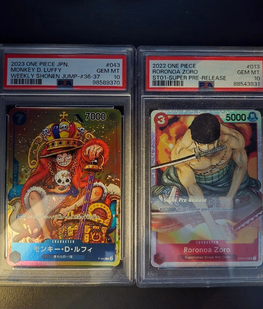 Selling two One Piece trading cards: - 2023 One Piece JPN. Monkey D. Luffy, Weekly Shonen Jump-#36-37, #043, GEM MT 10 - 2022 One Piece Roronoa Zoro, ST01-SUPER PRE-RELEASE, #013, GEM MT 10 130 for Both Together